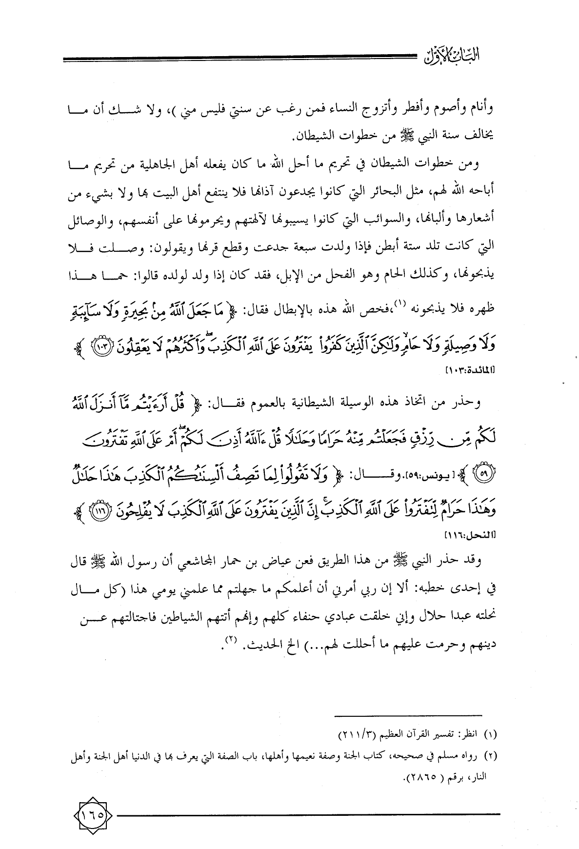 ومن خطوات الشيطان في تحريم ما أحل الله ما كان يفعله أهل الجاهلية من تحريم ما أباحه الله لهم, مثل البحائر التي كانوا يجدعون آذانها فلا ينتفع أهل البيت بها ولا بشيء من أشعارها وألبانها, والسوائب التي كانوا يسيبونها لآلهتهم ويحرمونها على أنفسهم, والوصائل التي كانت تلد ستة أبطن فإذا ولدت سبعة جدعت وقطع قرنها ويقولون: وصلت فلا يذبحونها, وكذلك الحام وهو الفحل من الإبل, فقد كان إذا ولد لولده قالوا: حما هذا ظهره فلا يذبحونه (¬١) ,فخص الله هذه بالإبطال فقال: {مَا جَعَلَ اللَّهُ مِنْ بَحِيرَةٍ وَلَا سَائِبَةٍ وَلَا وَصِيلَةٍ وَلَا حَامٍ وَلَكِنَّ الَّذِينَ كَفَرُوا يَفْتَرُونَ عَلَى اللَّهِ الْكَذِبَ وَأَكْثَرُهُمْ لَا يَعْقِلُونَ (١٠٣)} [المائدة:١٠٣]