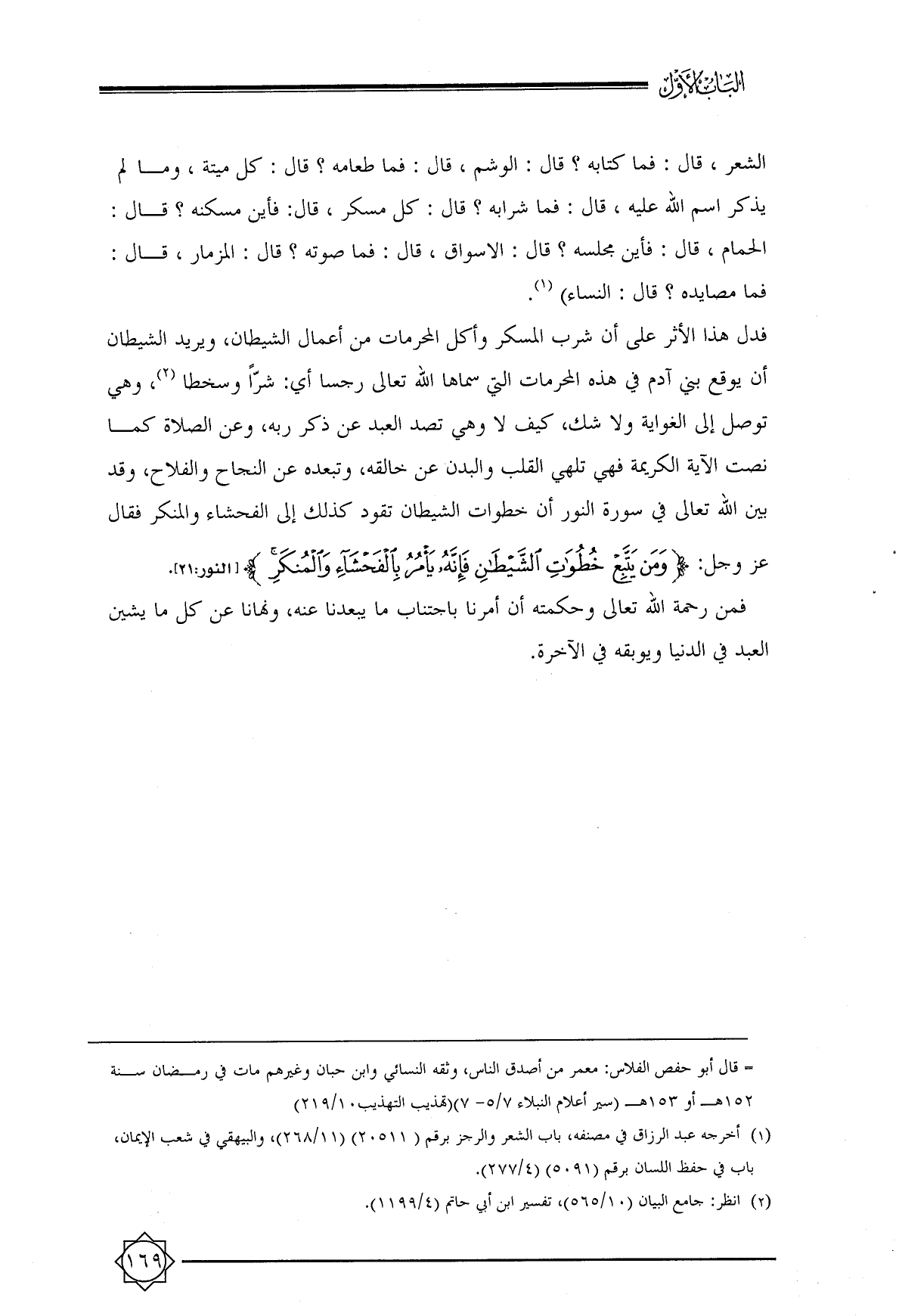 فدل هذا الأثر على أن شرب المسكر وأكل المحرمات من أعمال الشيطان, ويريد الشيطان أن يوقع بني آدم في هذه المحرمات التي سماها الله تعالى رجسا أي: شرّاً وسخطا (¬٢) , وهي توصل إلى الغواية ولا شك, كيف لا وهي تصد العبد عن ذكر ربه, وعن الصلاة كما نصت الآية الكريمة فهي تلهي القلب والبدن عن خالقه, وتبعده عن النجاح والفلاح, وقد بين الله تعالى في سورة النور أن خطوات الشيطان تقود كذلك إلى الفحشاء والمنكر فقال عز وجل: {وَمَنْ يَتَّبِعْ خُطُوَاتِ الشَّيْطَانِ فَإِنَّهُ يَأْمُرُ بِالْفَحْشَاءِ وَالْمُنْكَرِ} [النور:٢١].