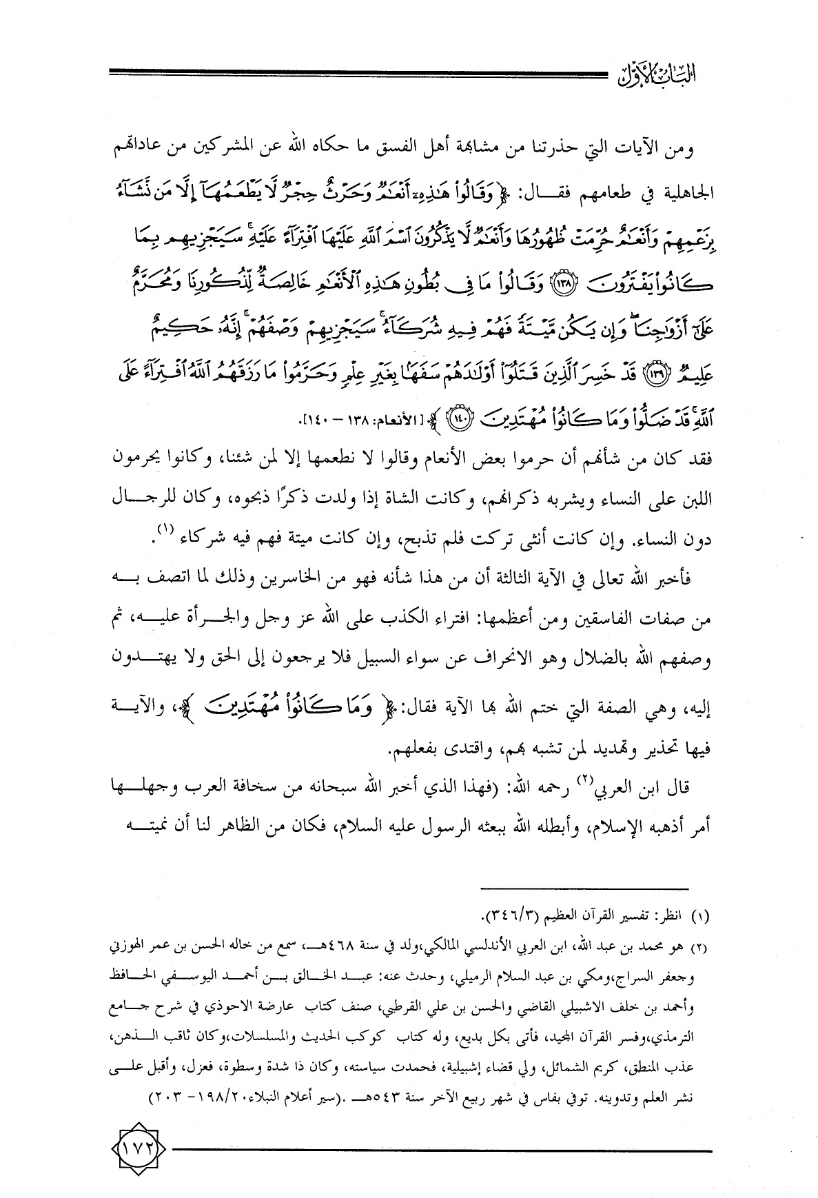 فأخبر الله تعالى في الآية الثالثة أن من هذا شأنه فهو من الخاسرين وذلك لما اتصف به من صفات الفاسقين ومن أعظمها: افتراء الكذب على الله عز وجل والجرأة عليه, ثم وصفهم الله بالضلال وهو الانحراف عن سواء السبيل فلا يرجعون إلى الحق ولا يهتدون إليه, وهي الصفة التي ختم الله بها الآية فقال: {وَمَا كَانُوا مُهْتَدِينَ} , والآية فيها تحذير وتهديد لمن تشبه بهم, واقتدى بفعلهم. قال ابن العربي (¬٢) رحمه الله: (فهذا الذي أخبر الله سبحانه من سخافة العرب وجهلها أمر أذهبه الإسلام، وأبطله الله ببعثه الرسول عليه السلام, فكان من الظاهر لنا أن نميته