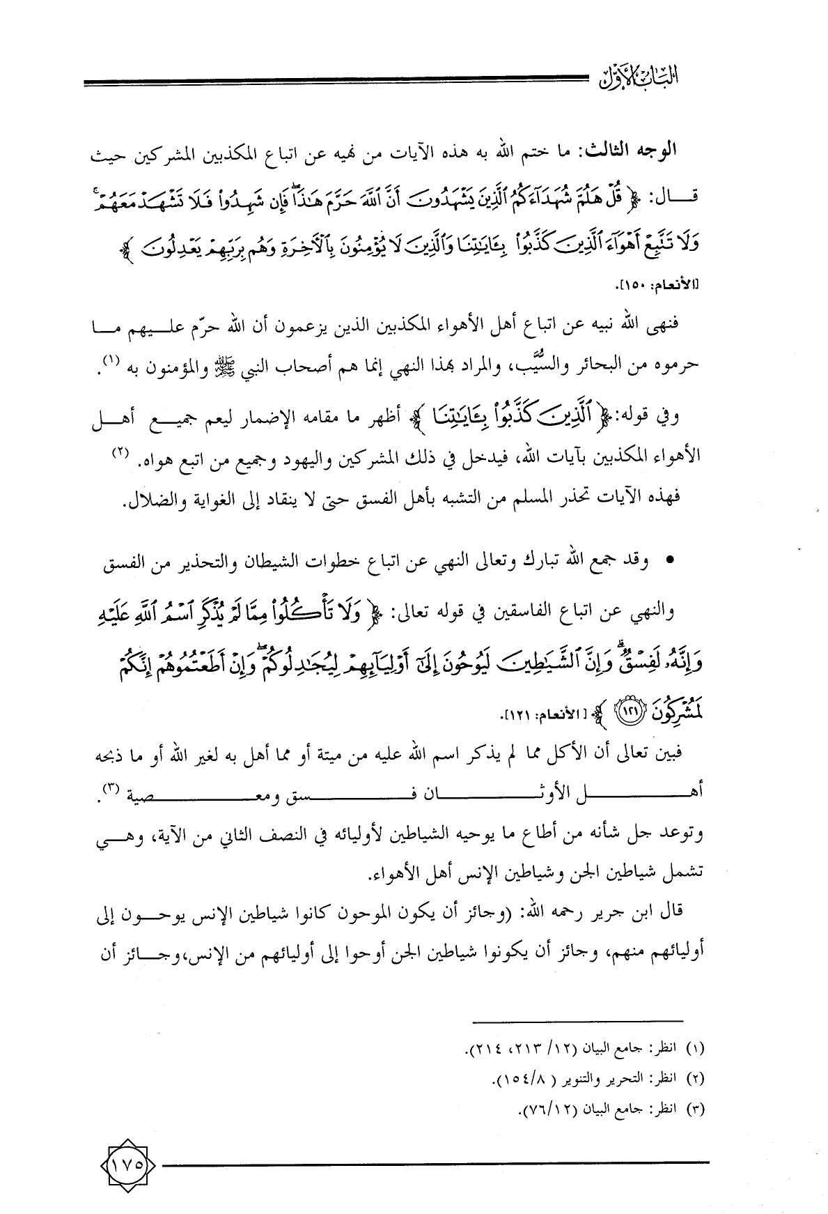 الوجه الثالث: ما ختم الله به هذه الآيات من نهيه عن اتباع المكذبين المشركين حيث قال: {قُلْ هَلُمَّ شُهَدَاءَكُمُ الَّذِينَ يَشْهَدُونَ أَنَّ اللَّهَ حَرَّمَ هَذَا فَإِنْ شَهِدُوا فَلَا تَشْهَدْ مَعَهُمْ وَلَا تَتَّبِعْ أَهْوَاءَ الَّذِينَ كَذَّبُوا بِآيَاتِنَا وَالَّذِينَ لَا يُؤْمِنُونَ بِالْآخِرَةِ وَهُمْ بِرَبِّهِمْ يَعْدِلُونَ} ... [الأنعام: ١٥٠].