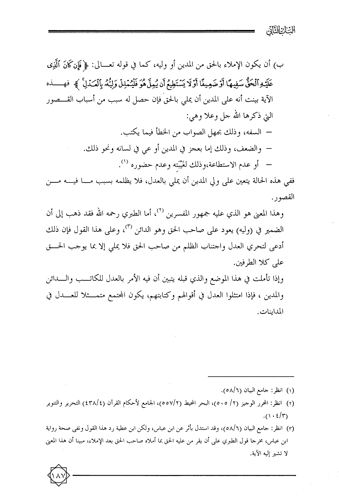 وهذا المعنى هو الذي عليه جمهور المفسرين (¬٢) , أما الطبري رحمه الله فقد ذهب إلى أن الضمير في (وليه) يعود على صاحب الحق وهو الدائن (¬٣) , وعلى هذا القول فإن ذلك أدعى لتحري العدل واجتناب الظلم من صاحب الحق فلا يملي إلا بما يوجب الحق على كلا الطرفين.