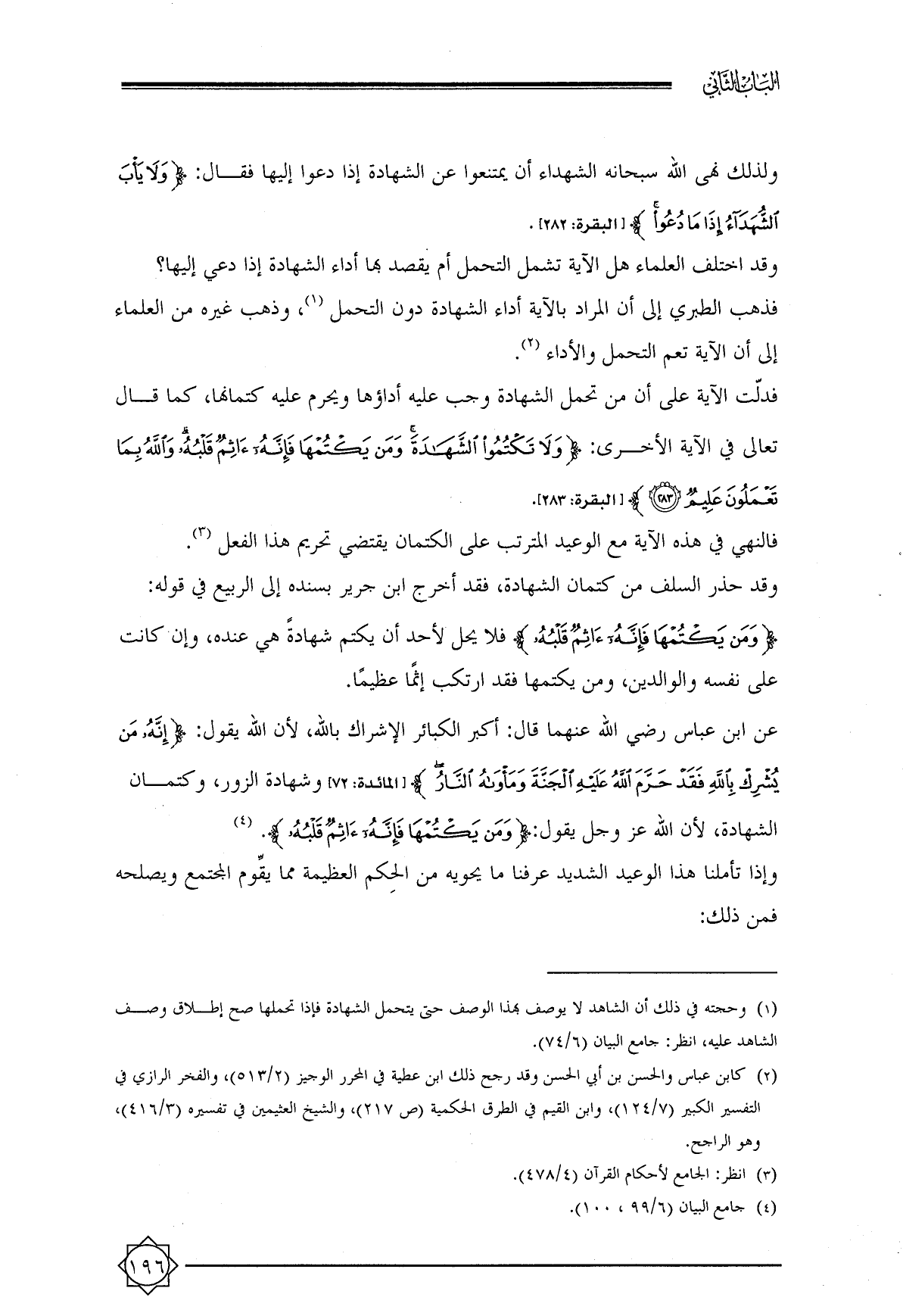 (¬١) وحجته في ذلك أن الشاهد لا يوصف بهذا الوصف حتى يتحمل الشهادة فإذا تحملها صح إطلاق وصف الشاهد عليه, انظر: جامع البيان (٦/ ٧٤).