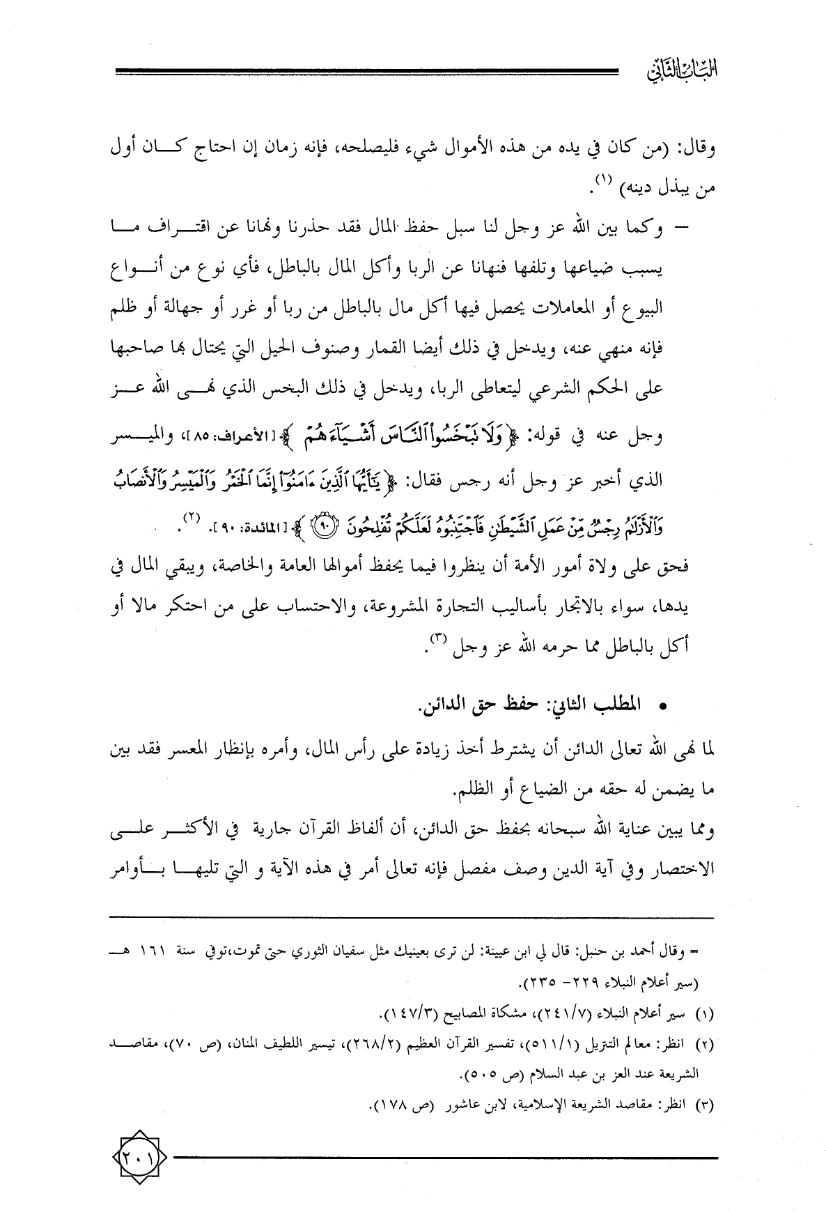 • وكما بين الله عز وجل لنا سبل حفظ المال فقد حذرنا ونهانا عن اقتراف ما يسبب ضياعها وتلفها فنهانا عن الربا وأكل المال بالباطل, فأي نوع من أنواع البيوع أو المعاملات يحصل فيها أكل مال بالباطل من ربا أو غرر أو جهالة أو ظلم فإنه منهي عنه, ويدخل في ذلك أيضا القمار وصنوف الحيل التي يحتال بها صاحبها على الحكم الشرعي ليتعاطى الربا, ويدخل في ذلك البخس الذي نهى الله عز وجل عنه في قوله: {وَلَا تَبْخَسُوا النَّاسَ أَشْيَاءَهُمْ} [الأعراف: ٨٥] , والميسر الذي أخبر عز وجل أنه رجس فقال: {يَاأَيُّهَا الَّذِينَ آمَنُوا إِنَّمَا الْخَمْرُ وَالْمَيْسِرُ وَالْأَنْصَابُ وَالْأَزْلَامُ رِجْسٌ مِنْ عَمَلِ الشَّيْطَانِ فَاجْتَنِبُوهُ لَعَلَّكُمْ تُفْلِحُونَ (٩٠)} [المائدة: ٩٠]. (¬٢).