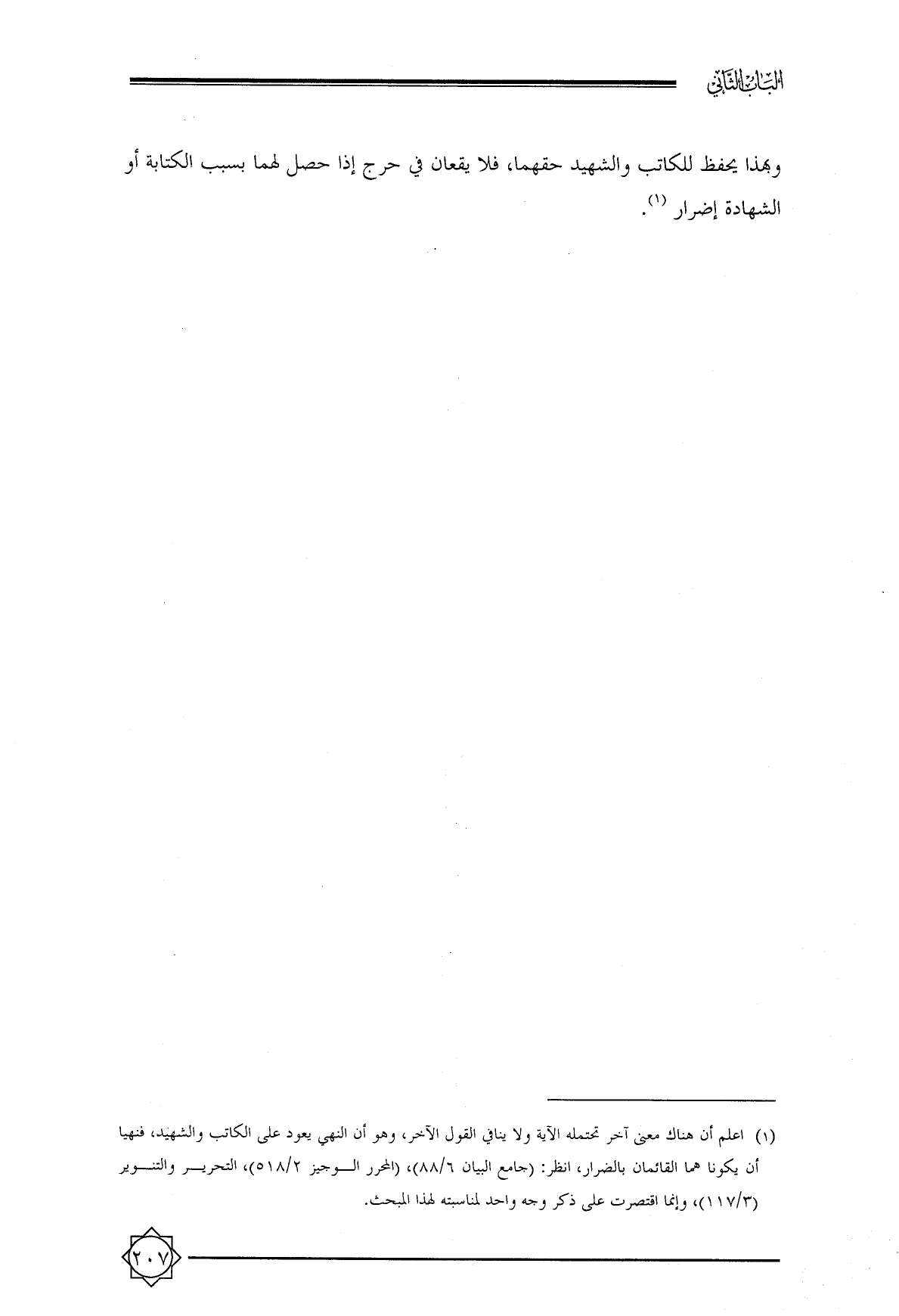 وبهذا يحفظ للكاتب والشهيد حقهما, فلا يقعان في حرج إذا حصل لهما بسبب الكتابة أو الشهادة إضرار (¬١).