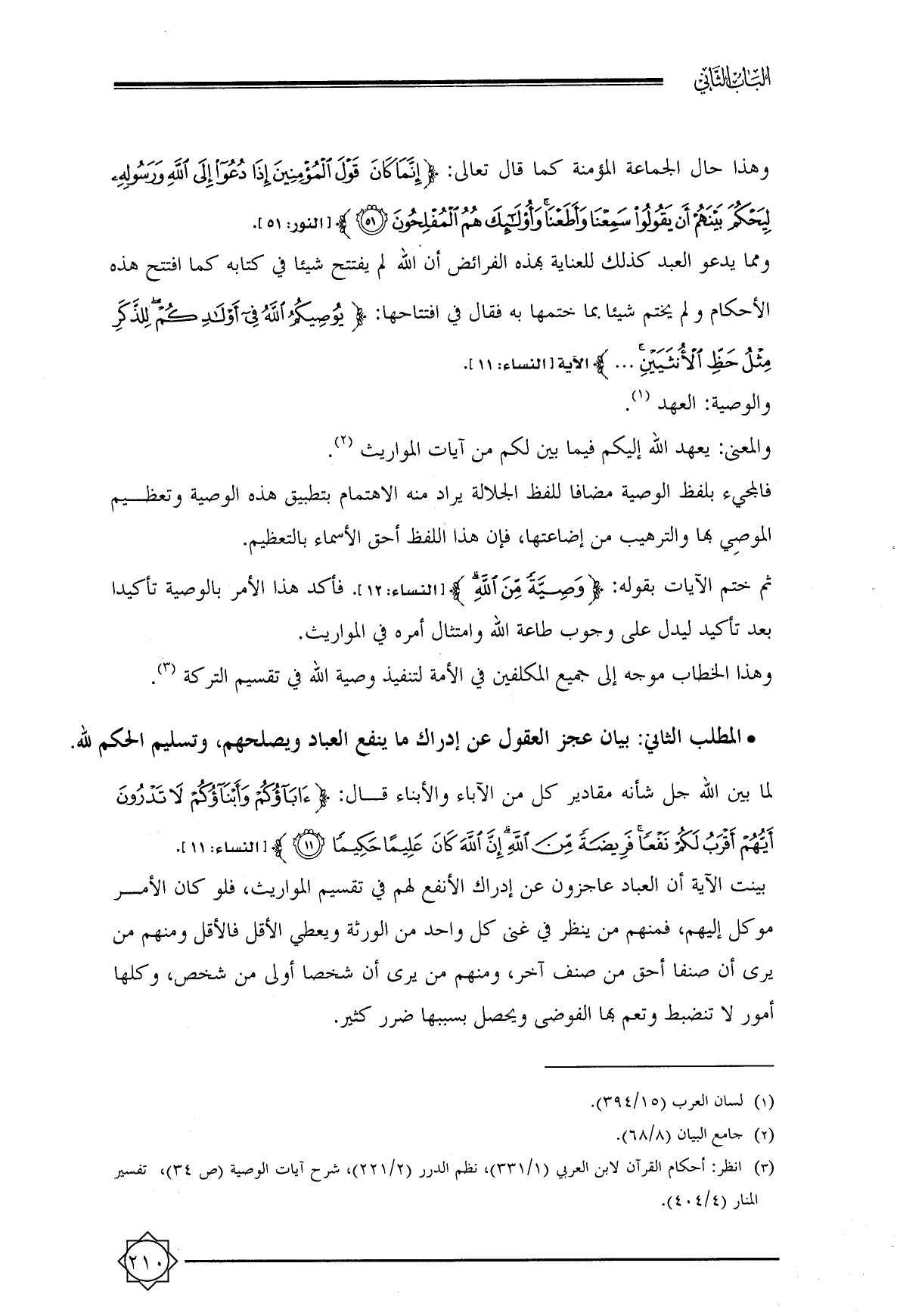 (¬٣) انظر: أحكام القرآن لابن العربي (١/ ٣٣١) , نظم الدرر (٢/ ٢٢١) , شرح آيات الوصية (ص ٣٤) , تفسير المنار (٤/ ٤٠٤).