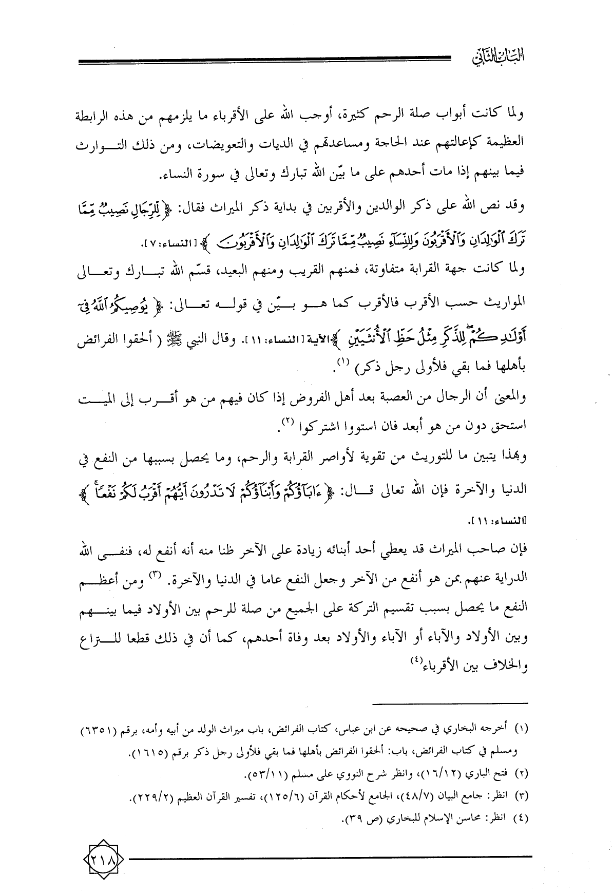 وبهذا يتبين ما للتوريث من تقوية لأواصر القرابة والرحم, وما يحصل بسببها من النفع في الدنيا والآخرة فإن الله تعالى قال: {آبَاؤُكُمْ وَأَبْنَاؤُكُمْ لَا تَدْرُونَ أَيُّهُمْ أَقْرَبُ لَكُمْ نَفْعًا} [النساء: ١١].