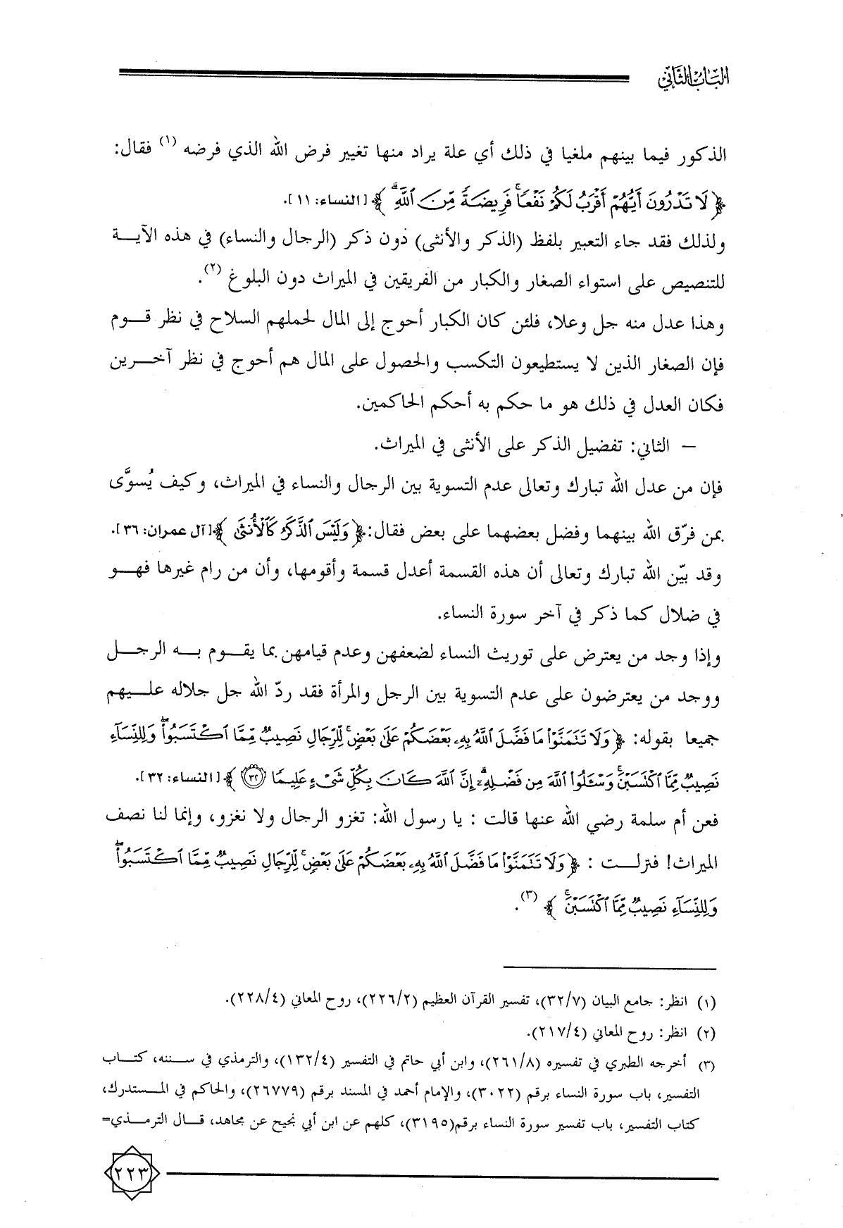 وإذا وجد من يعترض على توريث النساء لضعفهن وعدم قيامهن بما يقوم به الرجل ووجد من يعترضون على عدم التسوية بين الرجل والمرأة فقد ردّ الله جل جلاله عليهم جميعا بقوله: {وَلَا تَتَمَنَّوْا مَا فَضَّلَ اللَّهُ بِهِ بَعْضَكُمْ عَلَى بَعْضٍ لِلرِّجَالِ نَصِيبٌ مِمَّا اكْتَسَبُوا وَلِلنِّسَاءِ نَصِيبٌ مِمَّا اكْتَسَبْنَ وَاسْأَلُوا اللَّهَ مِنْ فَضْلِهِ إِنَّ اللَّهَ كَانَ بِكُلِّ شَيْءٍ عَلِيمًا (٣٢)} [النساء: ٣٢].