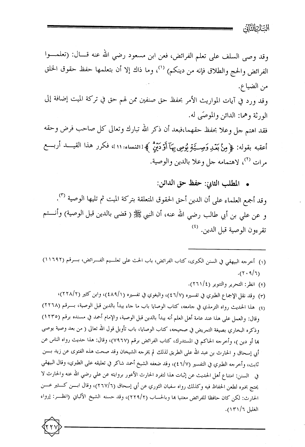 (¬٤) هذا الحديث رواه الترمذي في جامعه, كتاب الوصايا باب ما جاء يبدأ بالدين قبل الوصية, برقم (٢٢٦٨) وقال: والعمل على هذا عند عامة أهل العلم أنه يبدأ بالدين قبل الوصية, والإمام أحمد في مسنده برقم (١٢٣٥) وذكره البخاري بصيغة التمريض في صحيحه, كتاب الوصايا, باب تأويل قول الله تعالى (من بعد وصية يوصى بها أو دين) , وأخرجه الحاكم في المستدرك, كتاب الفرائض برقم (٧٩٦٧) , وقال: هذا حديث رواه الناس عن أبي إسحاق و الحارث بن عبد الله على الطريق لذلك لم يخرجه الشيخان وقد صحت هذه الفتوى عن زيد بن ثابت, وأخرجه الطبري في التفسير (٧/ ٤٦) , وقد ضعفه الشيخ أحمد شاكر في تعليقه على الطبري, وقال البيهقي في السنن: امتناع أهل الحديث عن إثبات هذا لتفرد الحارث الأعور بروايته عن علي رضي الله عنه والحارث لا يحتج بخبره لطعن الحفاظ فيه وكذلك رواه سفيان الثوري عن أبي إسحاق (٦/ ٢٦٧) , وقال ابن كثير عن الحارث: لكن كان حافظا للفرائض معتنيا بها وبالحساب (٢/ ٢٢٩) , وقد حسنه الشيخ الألباني (انظر: إرواء الغليل ٦/ ١٣١).