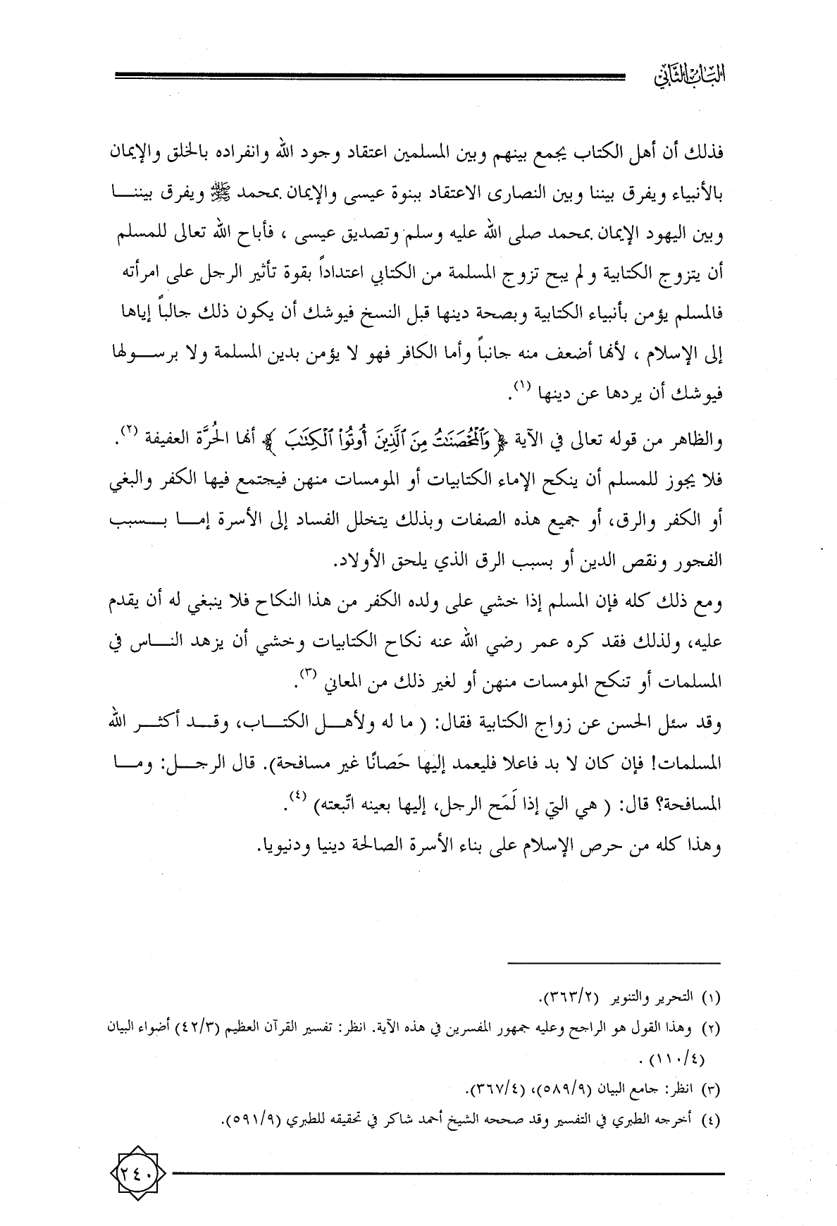 ومع ذلك كله فإن المسلم إذا خشي على ولده الكفر من هذا النكاح فلا ينبغي له أن يقدم عليه, ولذلك فقد كره عمر رضي الله عنه نكاح الكتابيات وخشي أن يزهد الناس في المسلمات أو تنكح المومسات منهن أو لغير ذلك من المعاني (¬٣).