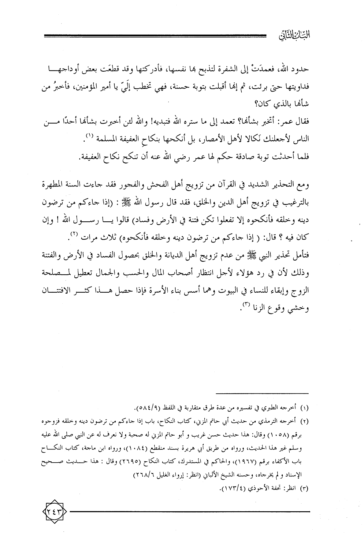 ومع التحذير الشديد في القرآن من تزويج أهل الفحش والفجور فقد جاءت السنة المطهرة بالترغيب في تزويج أهل الدين والخلق, فقد قال رسول الله - صلى الله عليه وسلم -: (إذا جاءكم من ترضون دينه وخلقه فأنكحوه إلا تفعلوا تكن فتنة في الأرض وفساد) قالوا يا رسول الله! وإن كان فيه؟ قال: (إذا جاءكم من ترضون دينه وخلقه فأنكحوه) ثلاث مرات (¬٢).