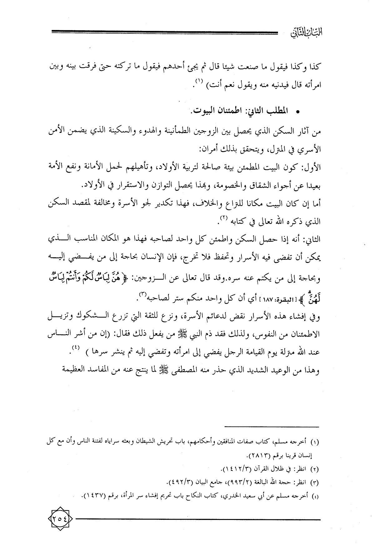 وفي إفشاء هذه الأسرار نقض لدعائم الأسرة, ونزع للثقة التي تزرع الشكوك وتزيل الاطمئنان من النفوس, ولذلك فقد ذم النبي - صلى الله عليه وسلم - من يفعل ذلك فقال: (إن من أشر الناس عند الله منزلة يوم القيامة الرجل يفضي إلى امرأته وتفضي إليه ثم ينشر سرها) (¬٤).