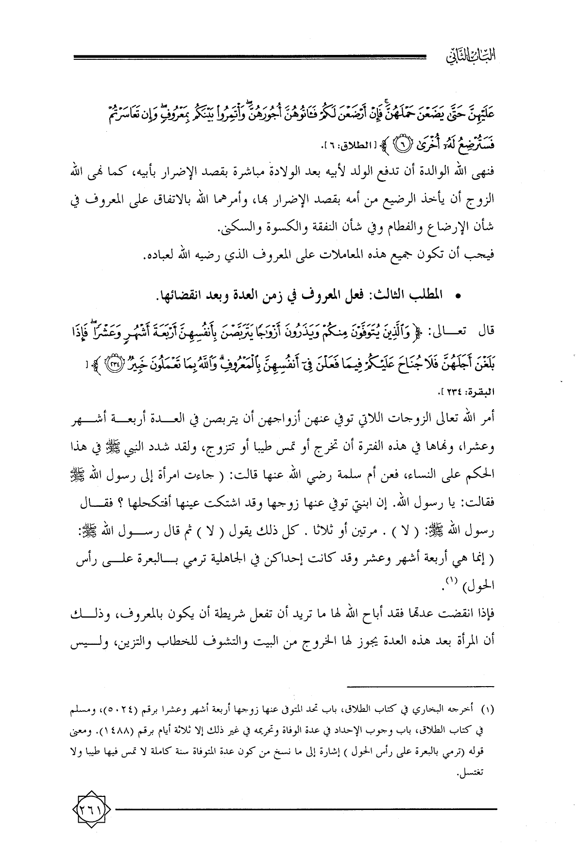 (¬١) أخرجه البخاري في كتاب الطلاق, باب تحد المتوفى عنها زوجها أربعة أشهر وعشرا برقم (٥٠٢٤) , ومسلم في كتاب الطلاق, باب وجوب الإحداد في عدة الوفاة وتحريمه في غير ذلك إلا ثلاثة أيام برقم (١٤٨٨). ومعنى قوله (ترمي بالبعرة على رأس الحول) إشارة إلى ما نسخ من كون عدة المتوفاة سنة كاملة لا تمس فيها طيبا ولا تغتسل.