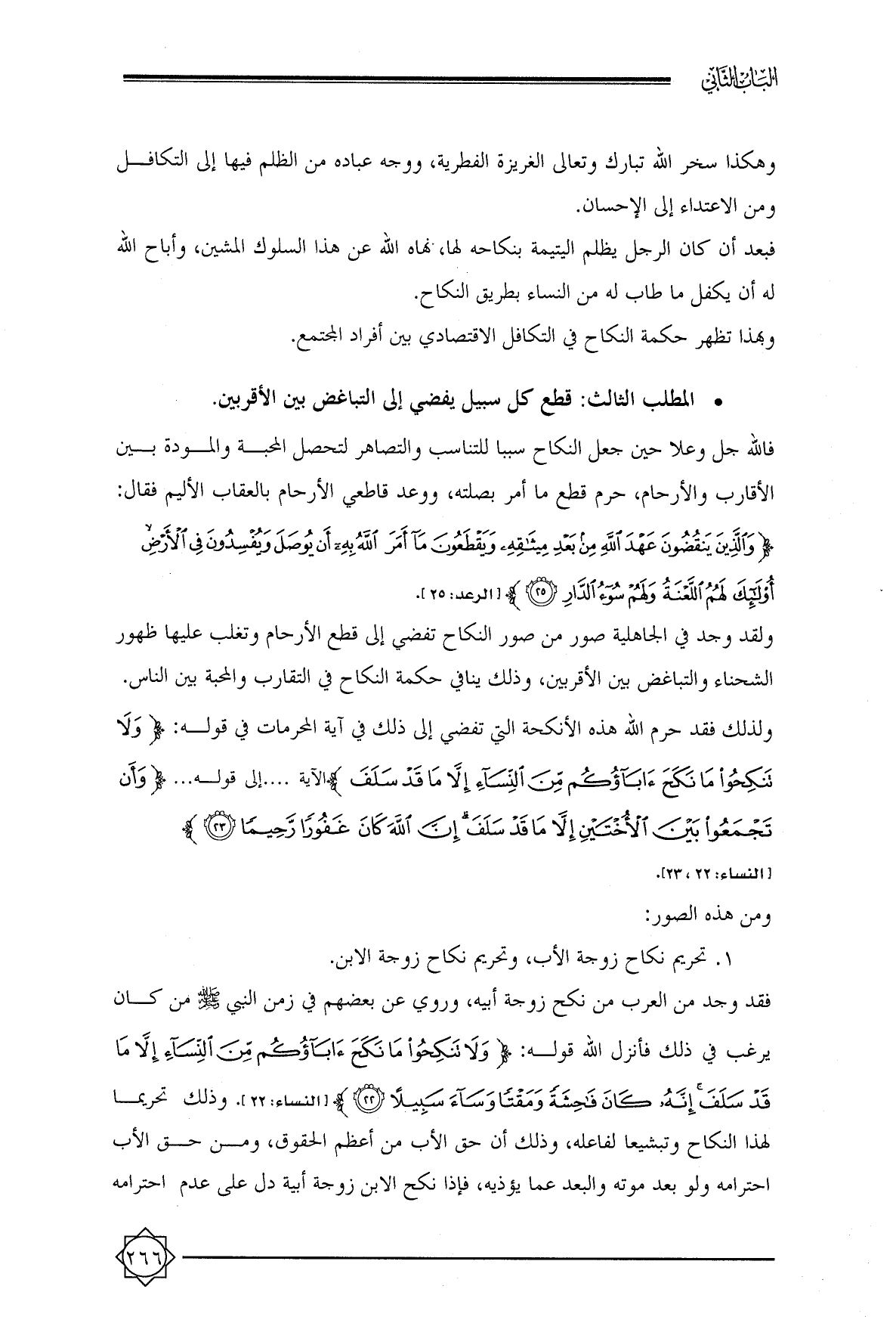 فالله جل وعلا حين جعل النكاح سببا للتناسب والتصاهر لتحصل المحبة والمودة بين الأقارب والأرحام, حرم قطع ما أمر بصلته, ووعد قاطعي الأرحام بالعقاب الأليم فقال: {وَالَّذِينَ يَنْقُضُونَ عَهْدَ اللَّهِ مِنْ بَعْدِ مِيثَاقِهِ وَيَقْطَعُونَ مَا أَمَرَ اللَّهُ بِهِ أَنْ يُوصَلَ وَيُفْسِدُونَ فِي الْأَرْضِ أُولَئِكَ لَهُمُ اللَّعْنَةُ وَلَهُمْ سُوءُ الدَّارِ (٢٥)} [الرعد: ٢٥].