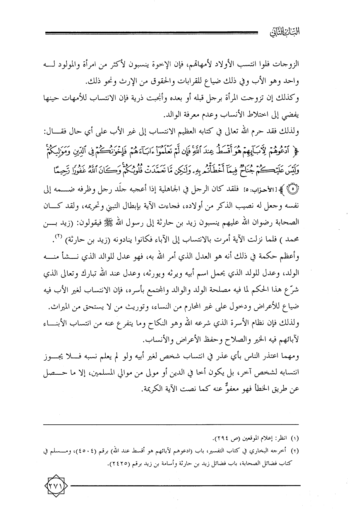 {ادْعُوهُمْ لِآبَائِهِمْ هُوَ أَقْسَطُ عِنْدَ اللَّهِ فَإِنْ لَمْ تَعْلَمُوا آبَاءَهُمْ فَإِخْوَانُكُمْ فِي الدِّينِ وَمَوَالِيكُمْ وَلَيْسَ عَلَيْكُمْ جُنَاحٌ فِيمَا أَخْطَأْتُمْ بِهِ وَلَكِنْ مَا تَعَمَّدَتْ قُلُوبُكُمْ وَكَانَ اللَّهُ غَفُورًا رَحِيمًا (٥)} [الأحزاب: ٥] فلقد كان الرجل في الجاهلية إذا أعجبه جلَد رجل وظرفه ضمه إلى نفسه وجعل له نصيب الذكر من أولاده, فجاءت الآية بإبطال التبني وتحريمه, ولقد كان الصحابة رضوان الله عليهم ينسبون زيد بن حارثة إلى رسول الله - صلى الله عليه وسلم - فيقولون: (زيد بن محمد) فلما نزلت الآية أمرت بالانتساب إلى الآباء فكانوا ينادونه (زيد بن حارثة) (¬١).
