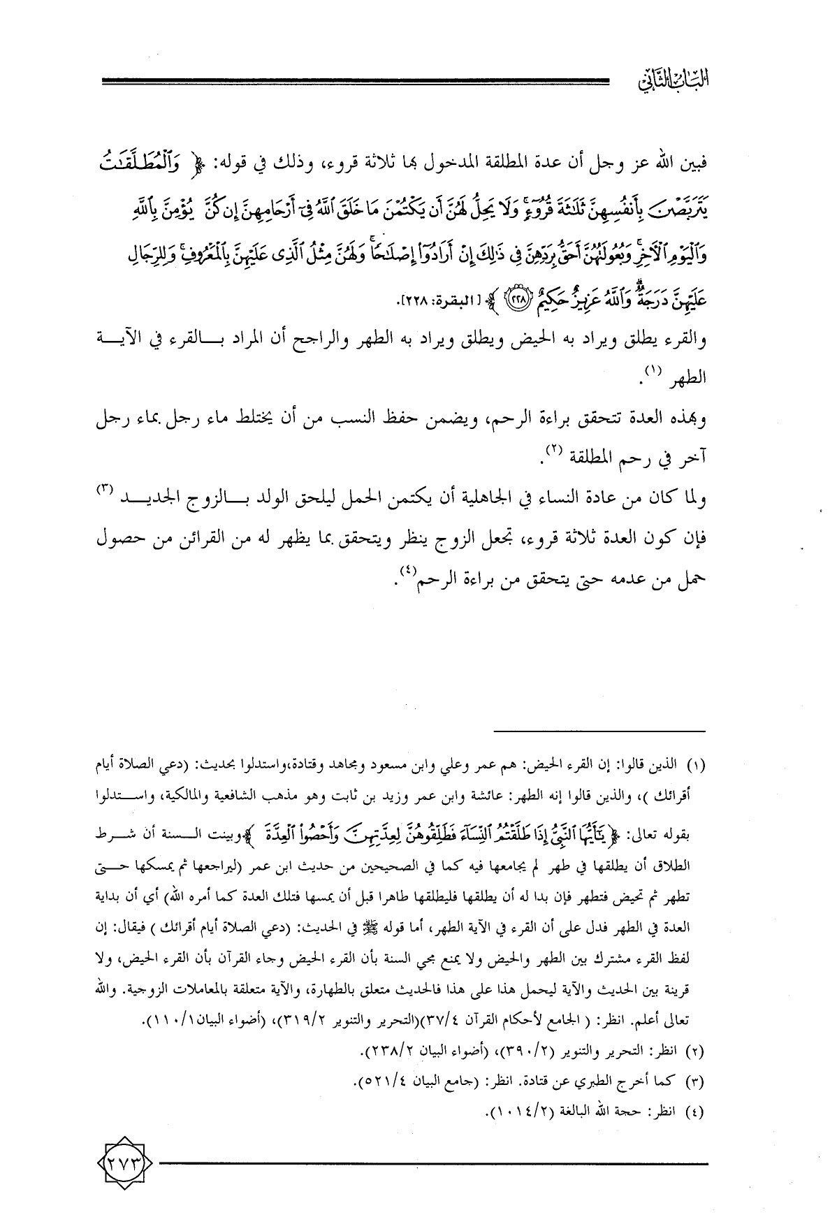 (¬١) الذين قالوا: إن القرء الحيض: هم عمر وعلي وابن مسعود ومجاهد وقتادة, واستدلوا بحديث: (دعي الصلاة أيام أقرائك) , والذين قالوا إنه الطهر: عائشة وابن عمر وزيد بن ثابت وهو مذهب الشافعية والمالكية, واستدلوا بقوله تعالى: {يَاأَيُّهَا النَّبِيُّ إِذَا طَلَّقْتُمُ النِّسَاءَ فَطَلِّقُوهُنَّ لِعِدَّتِهِنَّ وَأَحْصُوا الْعِدَّةَ} وبينت السنة أن شرط الطلاق أن يطلقها في طهر لم يجامعها فيه كما في الصحيحين من حديث ابن عمر (ليراجعها ثم يمسكها حتى تطهر ثم تحيض فتطهر فإن بدا له أن يطلقها فليطلقها طاهرا قبل أن يمسها فتلك العدة كما أمره الله) أي أن بداية العدة في الطهر فدل على أن القرء في الآية الطهر, أما قوله - صلى الله عليه وسلم - في الحديث: (دعي الصلاة أيام أقرائك) فيقال: إن لفظ القرء مشترك بين الطهر والحيض ولا يمنع مجي السنة بأن القرء الحيض وجاء القرآن بأن القرء الحيض, ولا قرينة بين الحديث والآية ليحمل هذا على هذا فالحديث متعلق بالطهارة, والآية متعلقة بالمعاملات الزوجية. والله تعالى أعلم. انظر: (الجامع لأحكام القرآن ٤/ ٣٧) (التحرير والتنوير ٢/ ٣١٩) , (أضواء البيان ١/ ١١٠).