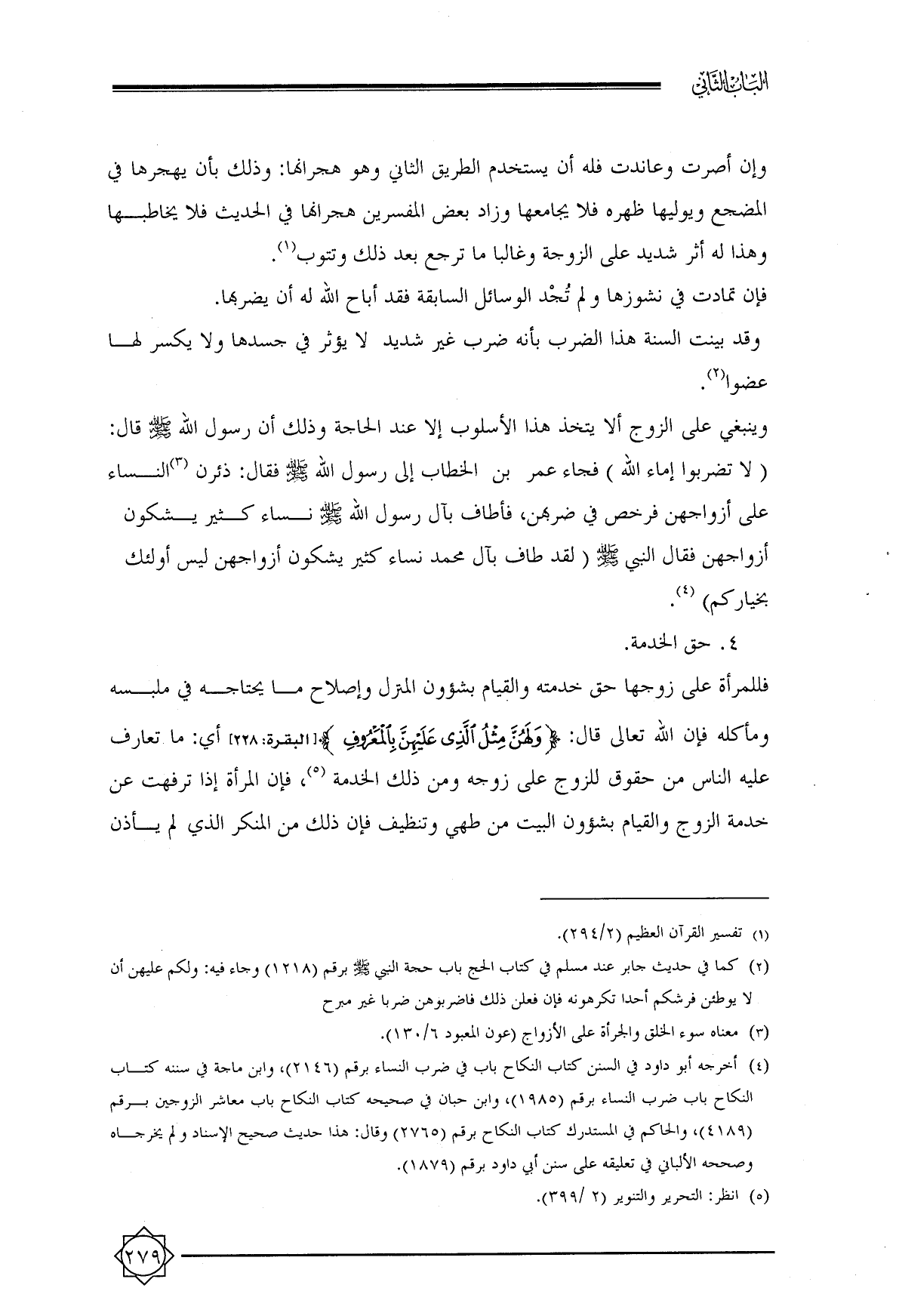 (¬٢) كما في حديث جابر عند مسلم في كتاب الحج باب حجة النبي - صلى الله عليه وسلم - برقم (١٢١٨) وجاء فيه: ولكم عليهن أن لا يوطئن فرشكم أحدا تكرهونه فإن فعلن ذلك فاضربوهن ضربا غير مبرح