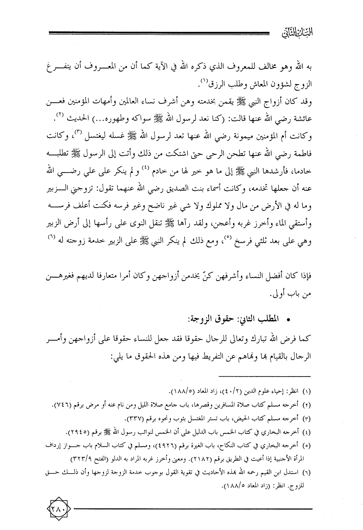 (¬٦) استدل ابن القيم رحمه الله بهذه الأحاديث في تقوية القول بوجوب خدمة الزوجة لزوجها وأن ذلك حق للزوج. انظر: (زاد المعاد ٥/ ١٨٨).