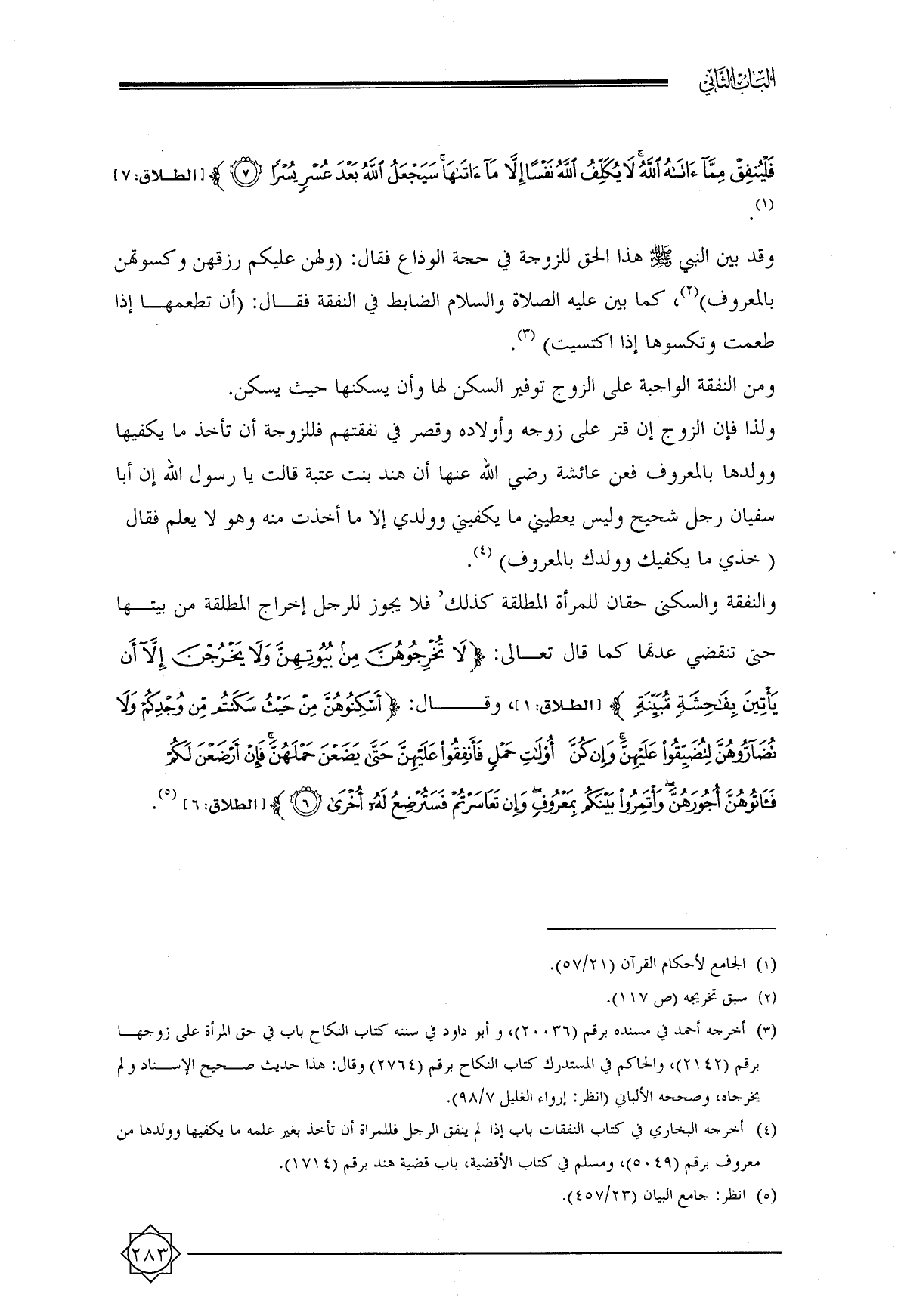 وقد بين النبي - صلى الله عليه وسلم - هذا الحق للزوجة في حجة الوداع فقال: (ولهن عليكم رزقهن وكسوتهن بالمعروف) (¬٢) , كما بين عليه الصلاة والسلام الضابط في النفقة فقال: (أن تطعمها إذا طعمت وتكسوها إذا اكتسيت) (¬٣).