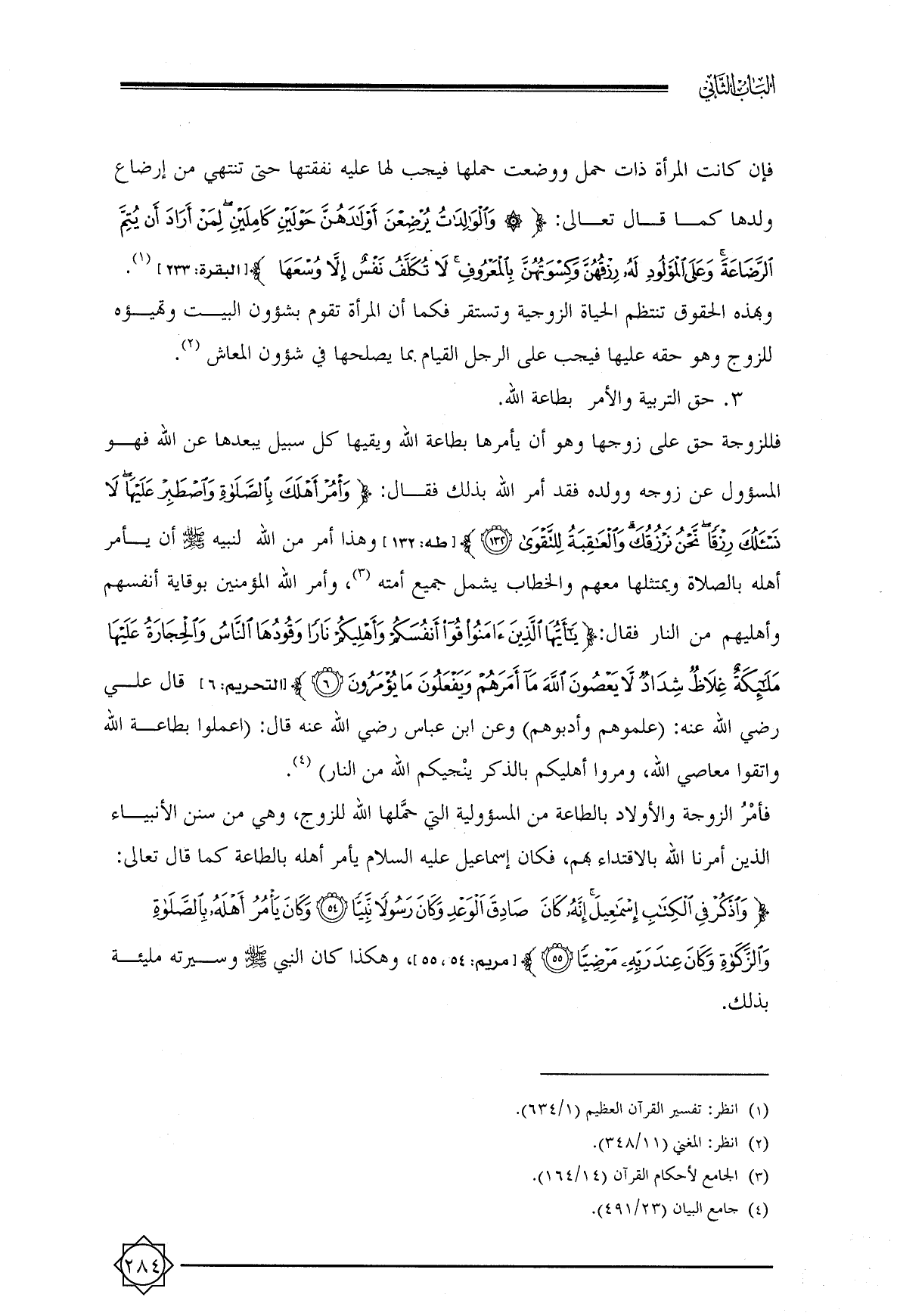فللزوجة حق على زوجها وهو أن يأمرها بطاعة الله ويقيها كل سبيل يبعدها عن الله فهو المسؤول عن زوجه وولده فقد أمر الله بذلك فقال: {وَأْمُرْ أَهْلَكَ بِالصَّلَاةِ وَاصْطَبِرْ عَلَيْهَا لَا نَسْأَلُكَ رِزْقًا نَحْنُ نَرْزُقُكَ وَالْعَاقِبَةُ لِلتَّقْوَى (١٣٢)} [طه: ١٣٢] وهذا أمر من الله لنبيه - صلى الله عليه وسلم - أن يأمر أهله بالصلاة ويمتثلها معهم والخطاب يشمل جميع أمته (¬٣) , وأمر الله المؤمنين بوقاية أنفسهم وأهليهم من النار فقال: {يَاأَيُّهَا الَّذِينَ آمَنُوا قُوا أَنْفُسَكُمْ وَأَهْلِيكُمْ نَارًا وَقُودُهَا النَّاسُ وَالْحِجَارَةُ عَلَيْهَا مَلَائِكَةٌ غِلَاظٌ شِدَادٌ لَا يَعْصُونَ اللَّهَ مَا أَمَرَهُمْ وَيَفْعَلُونَ مَا يُؤْمَرُونَ (٦)} [التحريم: ٦] قال علي رضي الله عنه: (علموهم وأدبوهم) وعن ابن عباس رضي الله عنه قال: (اعملوا بطاعة الله واتقوا معاصي الله، ومروا أهليكم بالذكر ينْجيكم الله من النار) (¬٤).
