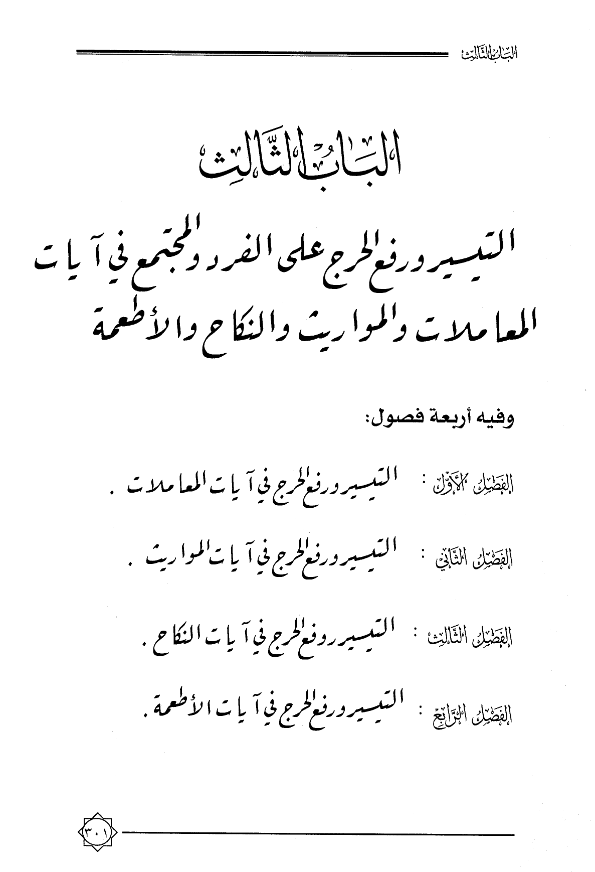 الباب الثالث: التيسير ورفع الحرج على الفرد والمجتمع في آيات المعاملات والمواريث والنكاح والأطعمة.