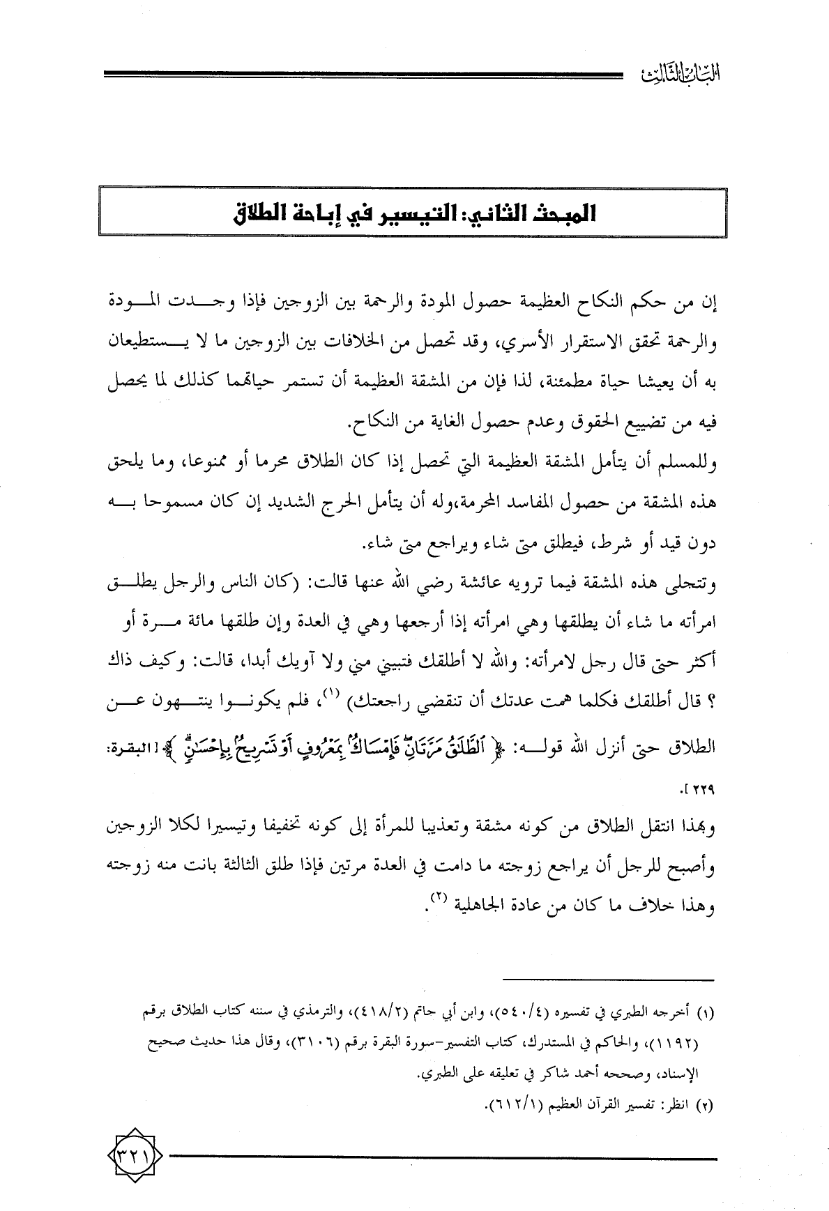 وبهذا انتقل الطلاق من كونه مشقة وتعذيبا للمرأة إلى كونه تخفيفا وتيسيرا لكلا الزوجين وأصبح للرجل أن يراجع زوجته ما دامت في العدة مرتين فإذا طلق الثالثة بانت منه زوجته وهذا خلاف ما كان من عادة الجاهلية (¬٢).