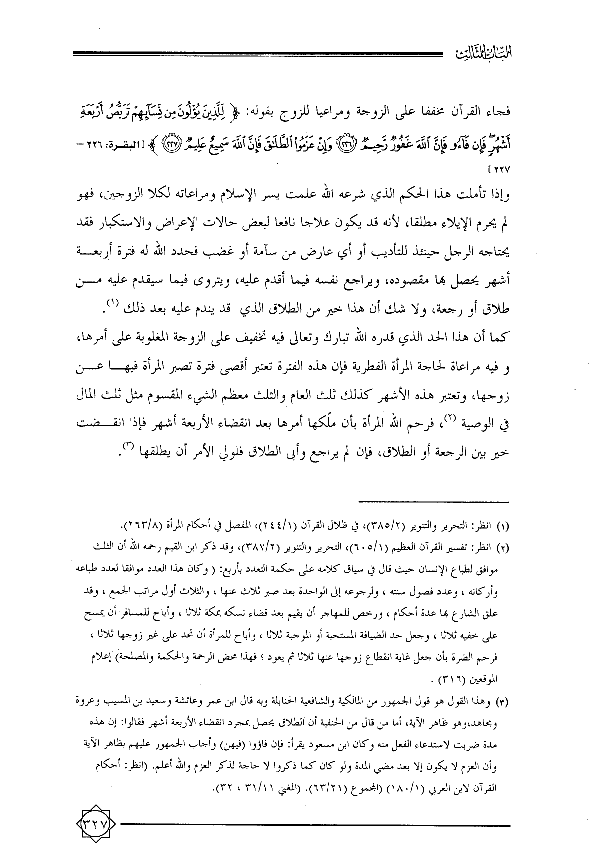 (¬٢) انظر: تفسير القرآن العظيم (١/ ٦٠٥) , التحرير والتنوير (٢/ ٣٨٧) , وقد ذكر ابن القيم رحمه الله أن الثلث موافق لطباع الإنسان حيث قال في سياق كلامه على حكمة التعدد بأربع: (وكان هذا العدد موافقا لعدد طباعه وأركانه، وعدد فصول سنته، ولرجوعه إلى الواحدة بعد صبر ثلاث عنها، والثلاث أول مراتب الجمع، وقد علق الشارع بها عدة أحكام، ورخص للمهاجر أن يقيم بعد قضاء نسكه بمكة ثلاثا، وأباح للمسافر أن يمسح على خفيه ثلاثا، وجعل حد الضيافة المستحبة أو الموجبة ثلاثا، وأباح للمرأة أن تحد على غير زوجها ثلاثا، فرحم الضرة بأن جعل غاية انقطاع زوجها عنها ثلاثا ثم يعود؛ فهذا محض الرحمة والحكمة والمصلحة) إعلام الموقعين (٣١٦).