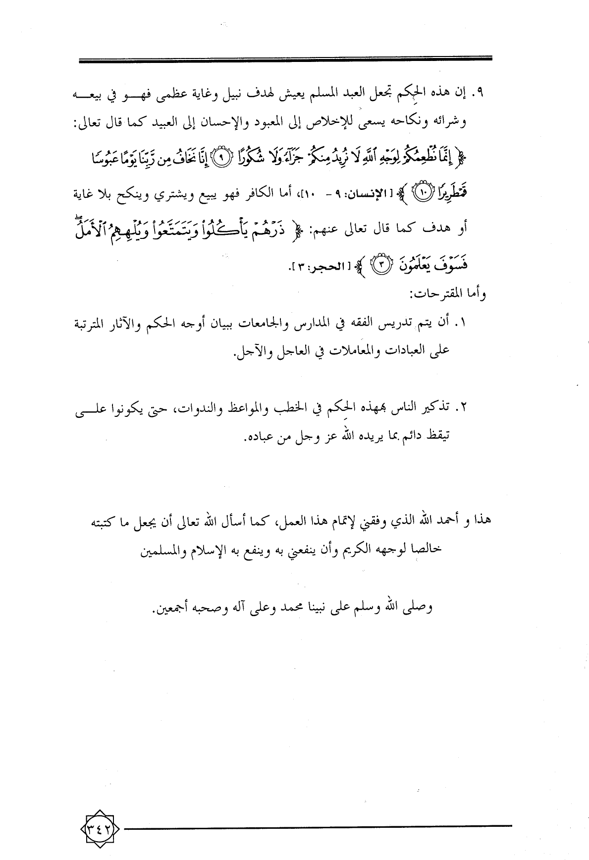 ١. أن يتم تدريس الفقه في المدارس والجامعات ببيان أوجه الحكم والآثار المترتبة على العبادات والمعاملات في العاجل والآجل.