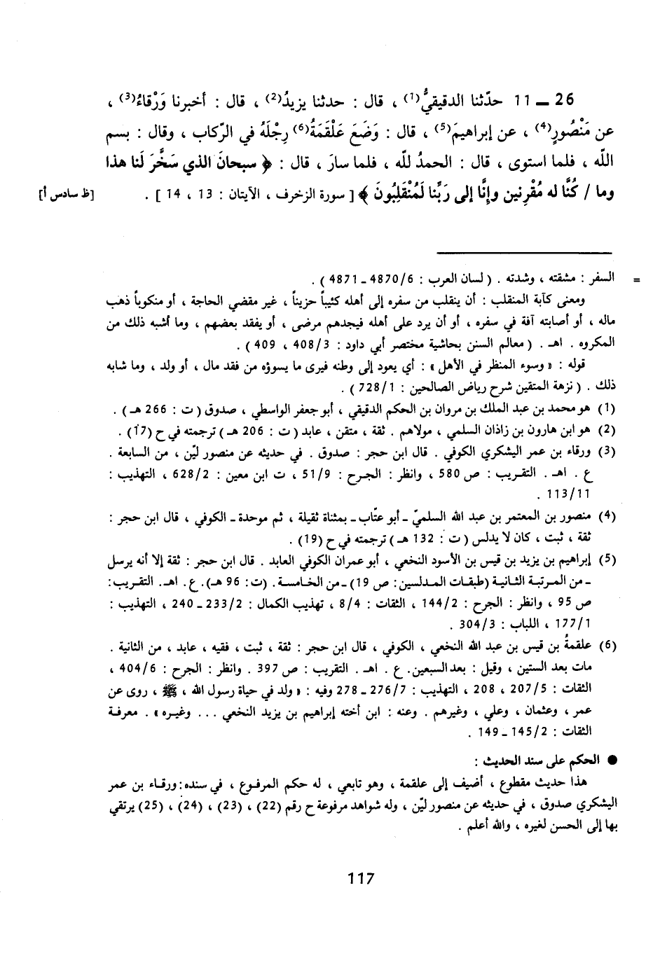 26 - (23) حَدَّثَنَا الدَّقِيقِيُّ قال: حَدَّثَنَا يَزِيدُ قال: أَخْبَرَنَا وَرْقَاءُ، عَنْ مَنْصُورٍ، عَنْ إِبْرَاهِيمَ قَالَ: وَضَعَ عَلْقَمَةُ رِجْلَهُ فِي الرِّكَابِ، وَقَالَ: «بِسْمِ اللَّهِ»، فَلَمَّا اسْتَوَى قَالَ: «الْحَمْدُ لِلَّهِ»، فَلَمَّا سَارَ؛ قَالَ: «سُبْحَانَ الَّذِي سَخَّرَ لَنَا هَذَا وَمَا كُنَّا لَهُ مُقْرِنِينَ وَإِنَّا إِلَى رَبِّنَا لَمُنْقَلِبُونَ»