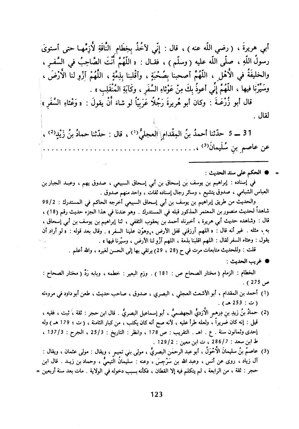 31 - (28) حَدَّثَنَا أَحْمَدُ بْنُ الْمِقْدَامِ الْعِجْلِيُّ قال: حَدَّثَنَا حَمَّادُ بْنُ زَيْدٍ، عَنْ عَاصِمِ بْنِ سُلَيْمَانَ، -[124]- عَنْ عَبْدِ اللَّهِ بْنِ سَرْجِسٍ قَالَ: كَانَ رَسُولُ اللَّهِ صَلَّى اللهُ عَلَيْهِ وَسَلَّمَ إِذَا سَافَرَ يَقُولُ: «اللَّهُمَّ إِنِّي أَعُوذُ بِكَ مِنْ وَعْثَاءِ السَّفَرِ، وَكَآبَةِ الْمُنْقَلَبِ، وَمِنَ الْحَوْرِ بَعْدَ الْكَوْنِ، وَدَعْوَةِ الْمَظْلُومِ، وَسُوءِ الْمَنْظَرِ فِي الْمَالِ وَالْأَهْلِ»