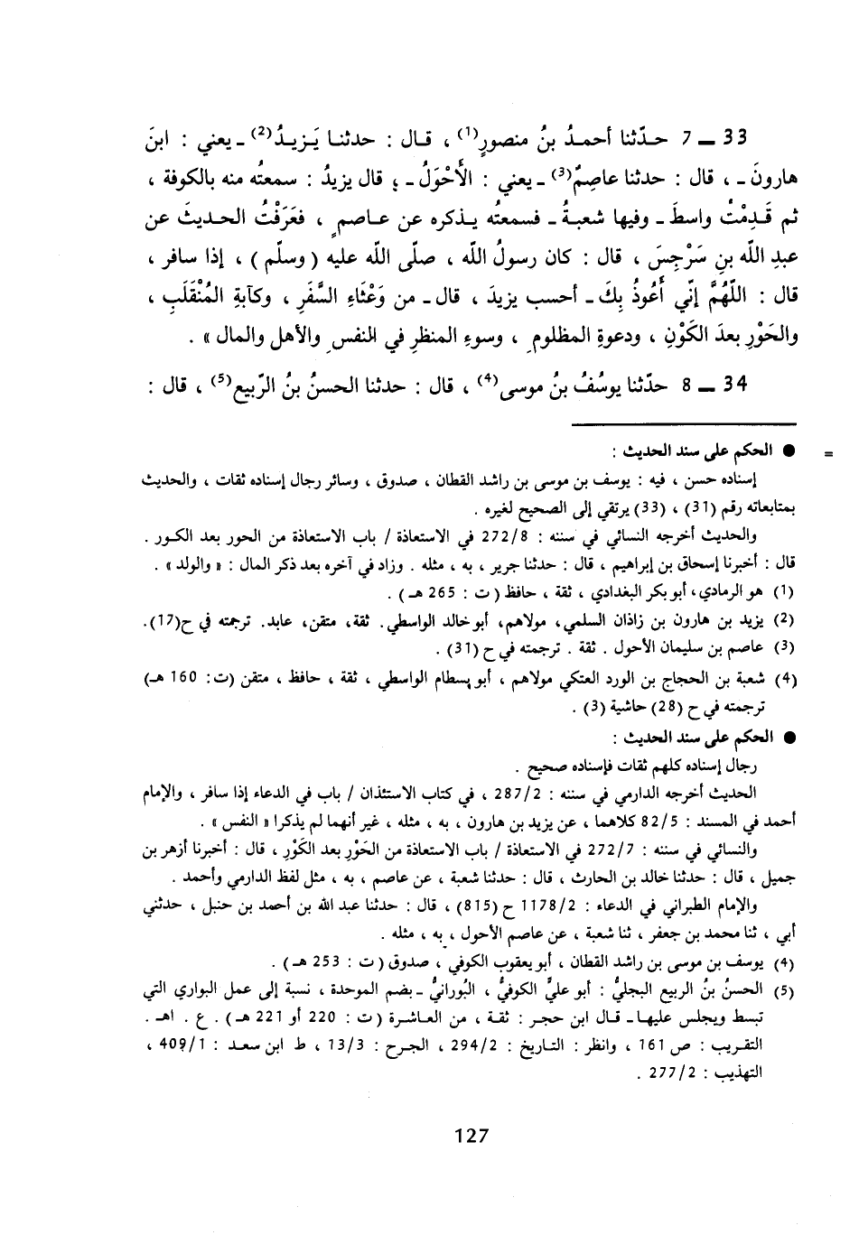 33 - (30) حَدَّثَنَا أَحْمَدُ بْنُ مَنْصُورٍ قال: حَدَّثَنَا يَزِيدُ يَعْنِي ابْنَ هَارُونَ قال حَدَّثَنَا عَاصِمٌ الْأَحْوَلُ قَالَ يَزِيدُ: سَمِعْتُهُ مِنْهُ، بِالْكُوفَةَ، ثُمَّ قَدِمْتُ وَاسِطَ وَفِيهَا شُعْبَةُ، فَسَمِعْتُهُ يَذْكُرُهُ عَنْ عَاصِمٍ، فَعَرَفْتُ الْحَدِيثَ - عَنْ عَبْدِ اللَّهِ بْنِ سَرْجِسٍ قَالَ: كَانَ رَسُولُ اللَّهِ صَلَّى اللهُ عَلَيْهِ وَسَلَّمَ إِذَا سَافَرَ قَالَ: " اللَّهُمَّ إِنِّي أَعُوذُ بِكَ - أَحْسَبُ يَزِيدَ قَالَ: مِنْ وَعْثَاءِ السَّفَرِ، وَكَآبَةِ الْمُنْقَلَبِ، وَالْحَوْرِ بَعْدَ الْكَوْنِ، وَدَعْوَةِ الْمَظْلُومِ، وَسُوءِ الْمَنْظَرِ فِي النَّفْسِ وَالْأَهْلِ وَالْمَالِ "