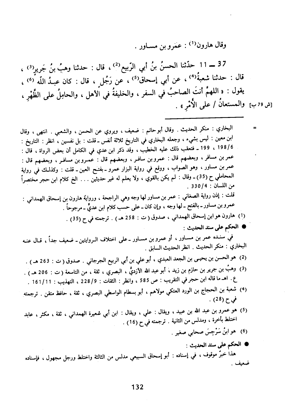 37 - (34) حَدَّثَنَا الْحَسَنُ بْنُ أَبِي الرَّبِيعِ قال: حَدَّثَنَا وَهْبُ بْنُ جَرِيرٍ قال: حَدَّثَنَا شُعْبَةُ، عَنْ أَبِي إِسْحَاقَ، عَنْ رَجُلٍ قَالَ: كَانَ عَبْدُ اللَّهِ يَقُولُ: «اللَّهُمَّ أَنْتَ الصَّاحِبُ فِي السَّفَرِ، وَالْخَلِيفَةُ فِي الْأَهْلِ، وَالْحَامِلُ عَلَى الظُّهْرِ، وَالْمُسْتَعَانُ عَلَى الْأَمْرِ»