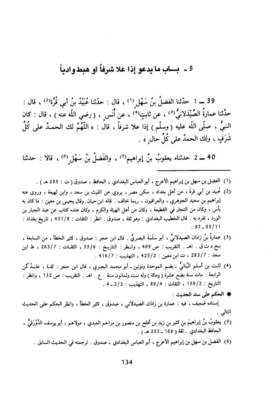 39 - (36) حَدَّثَنَا الْفَضْلُ بْنُ سَهْلٍ قال: حَدَّثَنَا عُبَيْدُ بْنُ أَبِي قُرَّةَ قال: حَدَّثَنَا عُمَارَةُ الصَّيْدَلَانِيُّ، عَنْ ثَابِتٍ، عَنْ أَنَسٍ، رَضِيَ اللَّهُ عَنْهُ قَالَ: كَانَ النَّبِيُّ صَلَّى اللهُ عَلَيْهِ وَسَلَّمَ إِذَا عَلَا شَرَفًا قَالَ: «اللَّهُمَّ لَكَ الْحَمْدُ عَلَى كُلِّ شَرَفٍ، وَلَكَ الْحَمْدُ عَلَى كُلِّ حَالٍ»