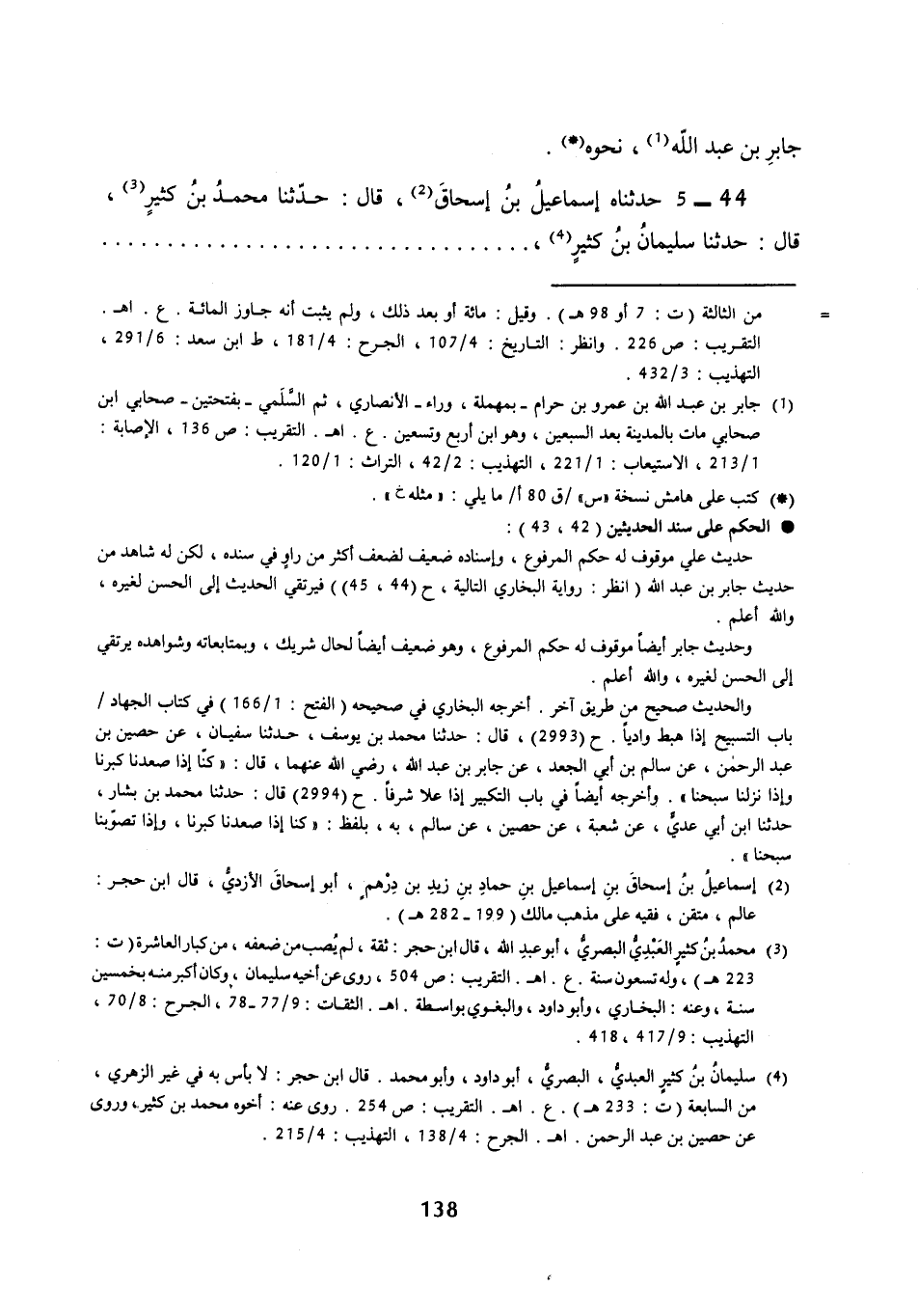 44 - (40) حَدَّثَنَاه إِسْمَاعِيلُ بْنُ إِسْحَاقَ قال: حَدَّثَنَا مُحَمَّدُ بْنُ كَثِيرٍ قال: حَدَّثَنَا سُلَيْمَانُ بْنُ كَثِيرٍ، -[139]- عَنْ حُصَيْنِ بْنِ عَبْدِ الرَّحْمَنِ، عَنْ أَبِي وَائِلٍ، وَسَالِمِ بْنِ أَبِي الْجَعْدِ، عَنْ جَابِرِ بْنِ عَبْدِ اللَّهِ، رَضِيَ اللَّهُ عَنْهُمَا قَالَ: «كُنَّا إِذَا صَعِدْنَا كَبَّرْنَا، وَإِذَا هَبَطْنَا سَبَّحْنَا»