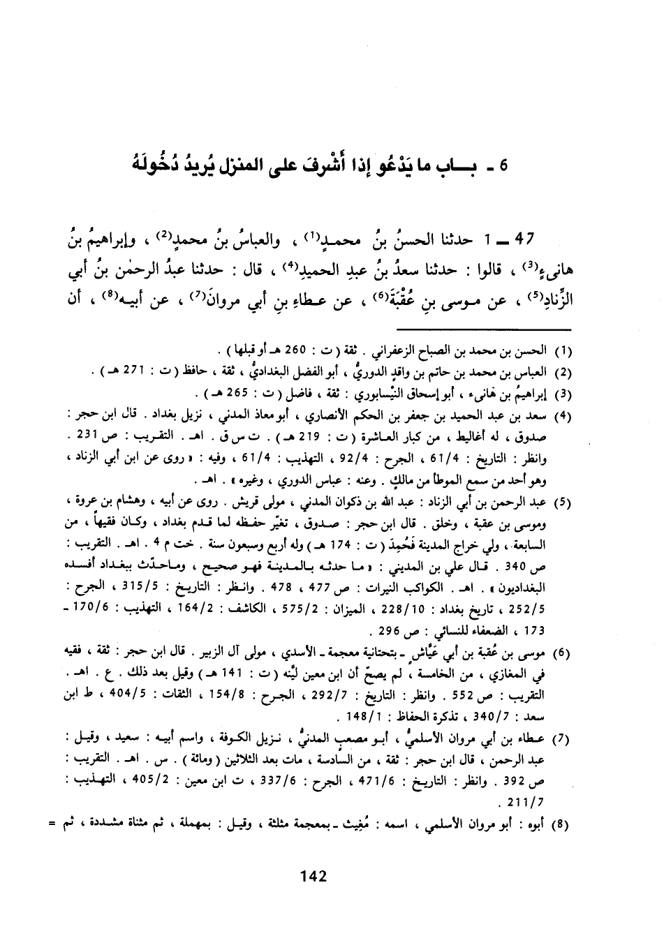 47 - (43) حَدَّثَنَا الْحَسَنُ بْنُ مُحَمَّدٍ، وَالْعَبَّاسُ بْنُ مُحَمَّدٍ، وَإِبْرَاهِيمُ بْنُ هَانِئٍ، قَالُوا: حَدَّثَنَا سَعْدُ بْنُ عَبْدِ الْحَمِيدِ قال: حَدَّثَنَا عَبْدُ الرَّحْمَنِ بْنُ أَبِي الزِّنَادِ، عَنْ مُوسَى بْنِ عُقْبَةَ، عَنْ عَطَاءِ بْنِ أَبِي مَرْوَانَ، عَنْ أَبِيهِ، أَنَّ -[143]- عَبْدَ الرَّحْمَنِ بْنَ مُغِيثٍ الْأَسْلَمِيَّ، حَدَّثَهُ قَالَ: قَالَ كَعْبٌ: مَا أَتَى مُحَمَّدٌ صَلَّى اللهُ عَلَيْهِ وَسَلَّمَ قَرْيَةً يُرِيدُ دُخُولَهَا إِلَّا قَالَ حين يراها: «اللَّهُمَّ رَبَّ السَّمَوَاتِ وَمَا أَظْلَلْنَ، وَرَبَّ الْأَرَضِينَ السَّبْعِ وَمَا أَقْلَلْنَ، وَرَبَّ الشَّيَاطِينِ وَمَا أَضْلَلْنَ، وَرَبَّ الرِّيَاحِ وَمَا ذَرَيْنَ، فَإِنَّا نَسْأَلُكَ خَيْرَ هَذِهِ الْقَرْيَةِ وَخَيْرَ أَهْلِهَا، وَنَعُوذُ بِكَ مِنْ شَرِّهَا وَشَرِّ أَهْلِهَا وَشَرِّ مَا فِيهَا»