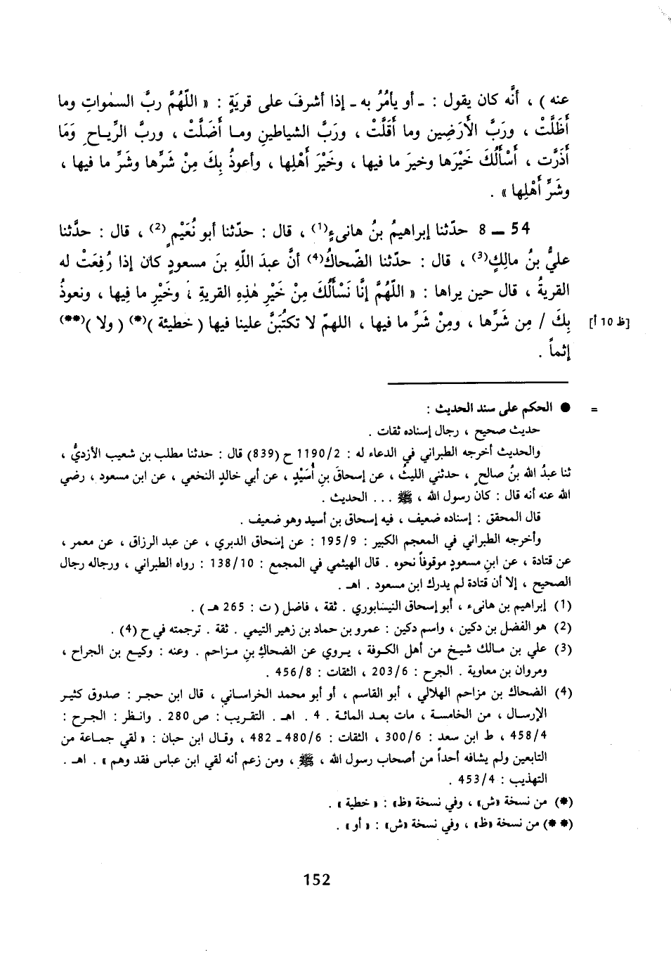 54 - (50) حَدَّثَنَا إِبْرَاهِيمُ بْنُ هَانِئٍ قال: حَدَّثَنَا أَبُو نُعَيْمٍ قال: حَدَّثَنَا عَلِيُّ بْنُ مَالِكٍ قال: حَدَّثَنَا الضَّحَّاكُ، أَنَّ عَبْدَ اللَّهِ بْنَ مَسْعُودٍ، كَانَ إِذَا رُفِعَتْ لَهُ الْقَرْيَةُ قَالَ حِينَ يَرَاهَا: «اللَّهُمَّ إِنَّا نَسْأَلُكَ مِنْ خَيْرِ هَذِهِ الْقَرْيَةِ وَخَيْرِ ما فيها، وَنَعُوذُ بِكَ مِنْ شَرِّهَا وَمن شَرِّ مَا فِيهَا، اللَّهُمَّ لَا تَكْتُبَنَّ عَلَيْنَا فيها خَطِيئَةً ولا إِثْمًا»