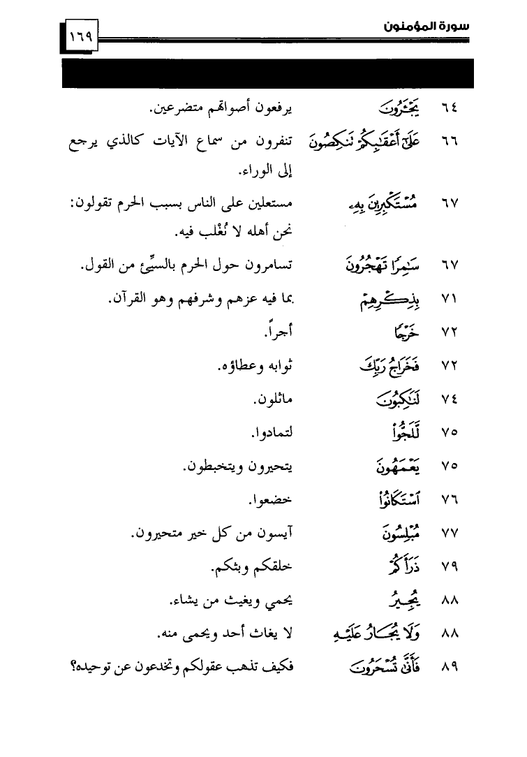 (64) ... {يَجْأَرُونَ} ... يَرْفَعُونَ أَصْوَاتَهُمْ مُتَضَرِّعِينَ.