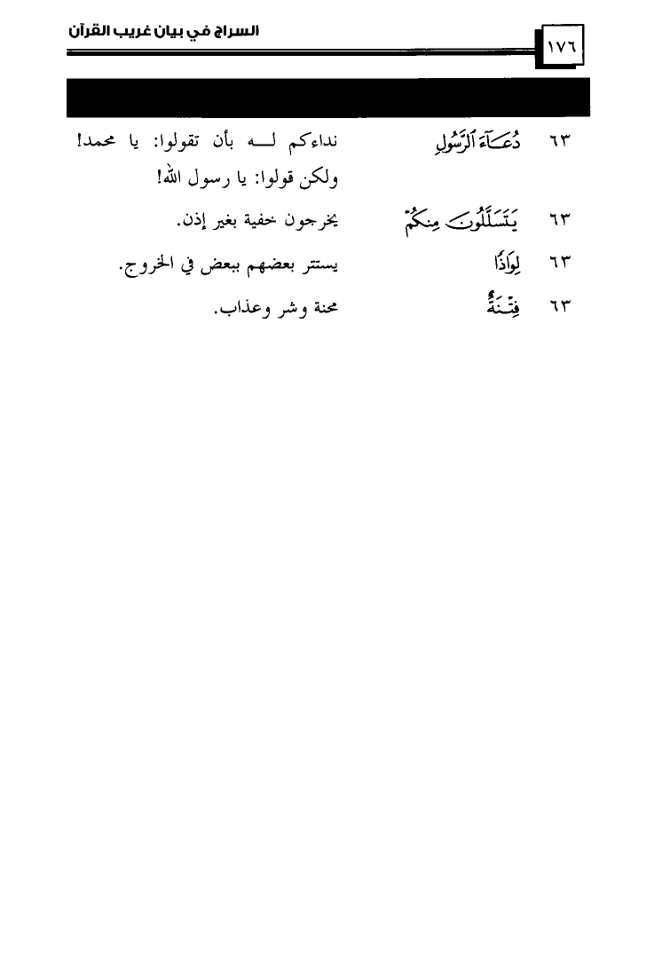 (63) ... {يَتَسَلَّلُونَ مِنكُمْ} ... يَخْرُجُونَ خُفْيَةً بِغَيْرِ إِذْنٍ.