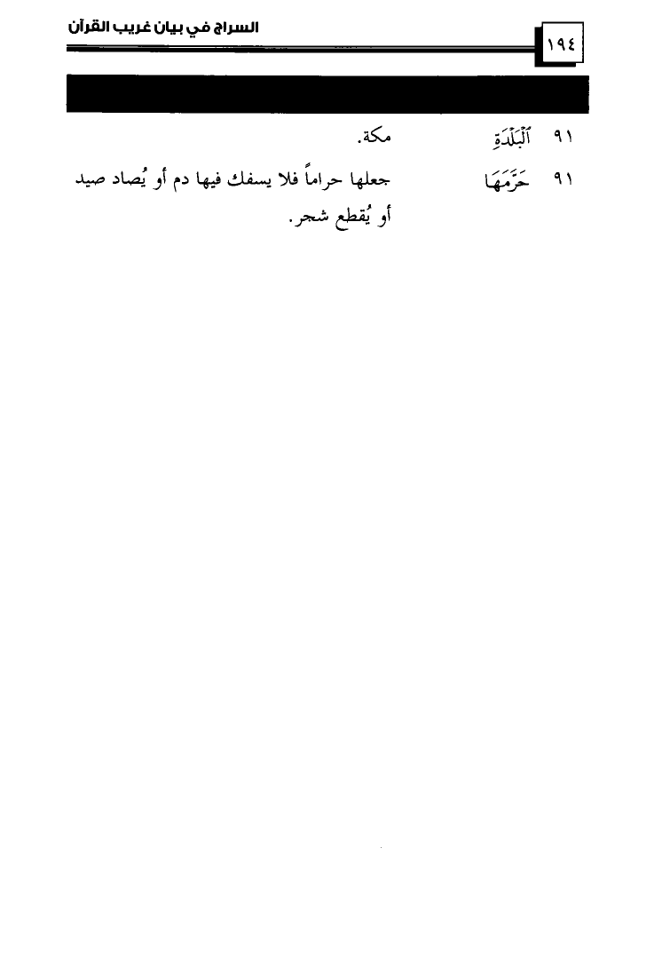 (91) ... {حَرَّمَهَا} ... جَعَلَهَا حَرَامًا؛ فَلَا يُسْفَكُ فِيهَا دَمٌ، أَوْ يُصَادُ صَيْدٌ، أَوْ يُقْطَعُ شَجَرٌ.