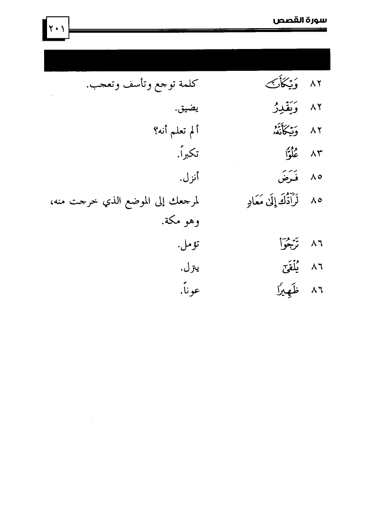 (85) ... {لَرَادُّكَ إِلَى مَعَادٍ} ... لَمُرْجِعُكَ إِلَى المَوْضِعِ الَّذِي خَرَجْتَ مِنَهُ، وَهُوَ مَكَّةُ.
