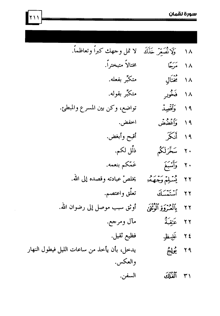 (18) ... {وَلَا تُصَعِّرْ خَدَّكَ} ... لَا تُمِلْ وَجْهَكَ كِبْرًا وَتَعَاظُمًا.