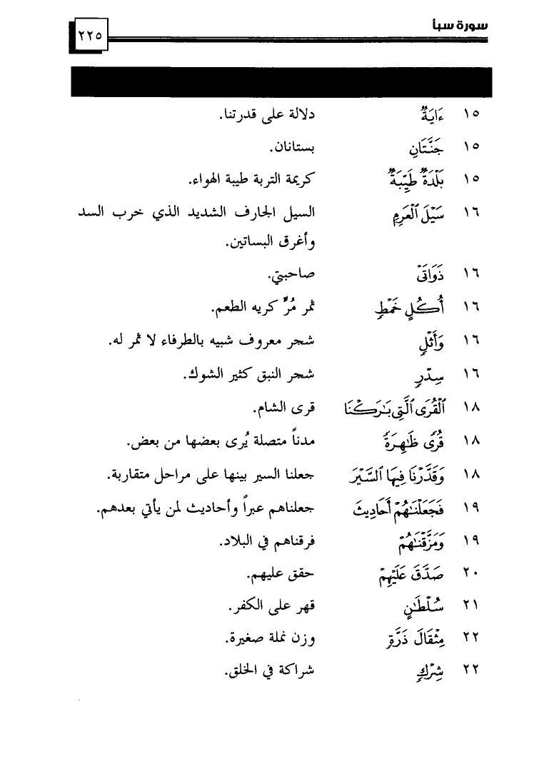 (16) ... {سَيْلَ الْعَرِمِ} ... السَّيْلَ الجَارِفَ الشَّدِيدَ الَّذِي خَرَّبَ السَّدَّ، وَأَغْرَقَ البَسَاتِينَ.