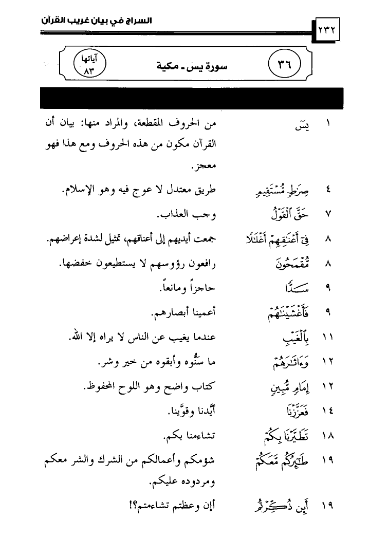 (1) ... {يس} ... مِنَ الحُروُفِ المُقَطَّعَةِ، وَالمُرَادُ مِنْهَا: بَيَانُ أَنَّ القُرْآنَ مُكَوَّنٌ مِنْ هَذِهِ الحُرُوفِ؛ وَمَعَ هَذَا فَهُوَ مُعْجِزٌ، وَلَيْسَ «يس» اسْمًا لِلنَّبِيِّ - صلى الله عليه وسلم -.
