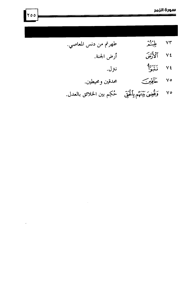 (75) ... {وَقُضِيَ بَيْنَهُم بِالْحَقِّ} ... حُكِمَ بَيْنَ الخَلَائِقِ بِالعَدْلِ.