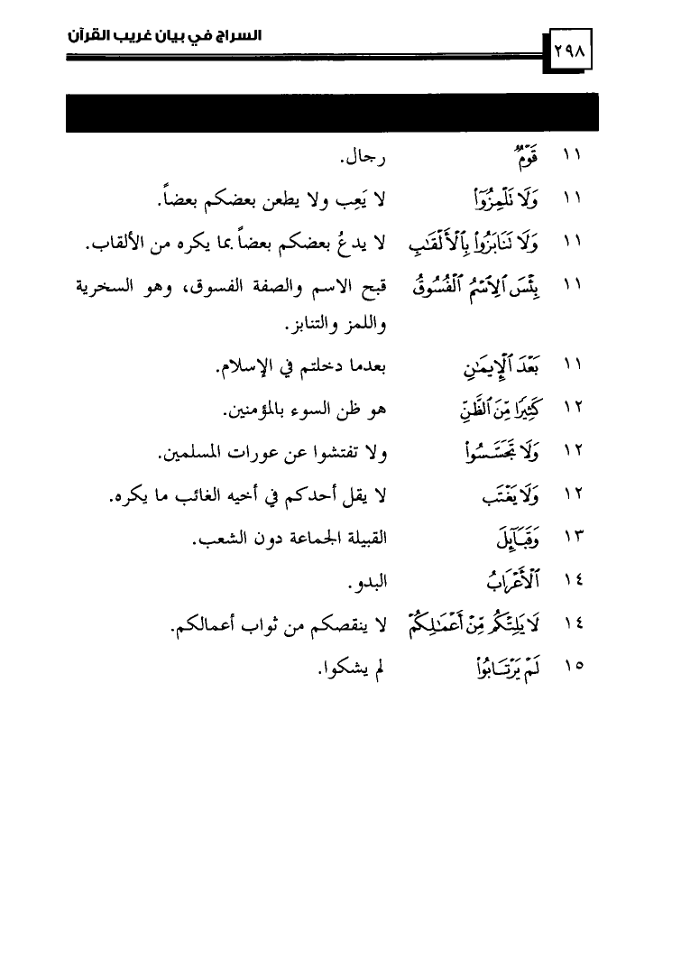 (11) ... {وَلَا تَنَابَزُوا بِالْأَلْقَابِ} ... لَا يَدْعُ بَعْضُكُمْ بَعْضًا بِمَا يَكْرَهُ مِنَ الأَلْقَابِ.