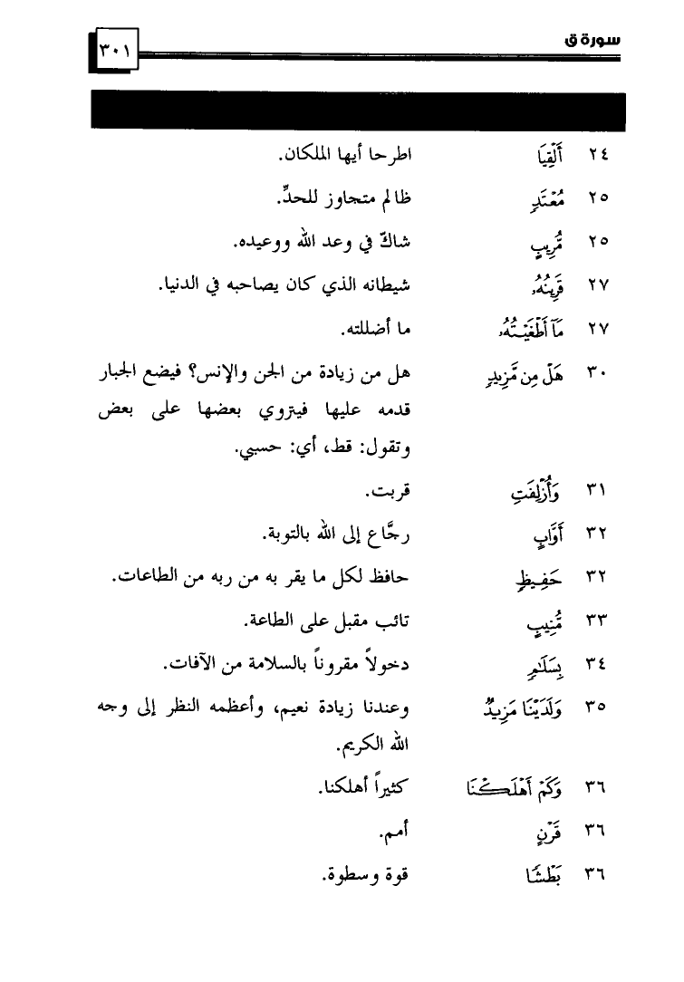 (30) ... {هَلْ مِن مَّزِيدٍ} ... هَلْ مِنْ زِيَادَةٍ مِنَ الجِنِّ وَالإِنْسِ؟! فَيَضَعُ الجَبَّارُ قَدَمَهُ عَلَيْهَا، فَيَنْزَوِي بَعْضُهَا عَلَى بَعْضٍ، وَتَقُولُ: قَطْ قَطْ، أَيْ: حَسْبِي؛ كَمَا ثَبَتَ فِي الحَدِيثِ الصَّحِيحِ.