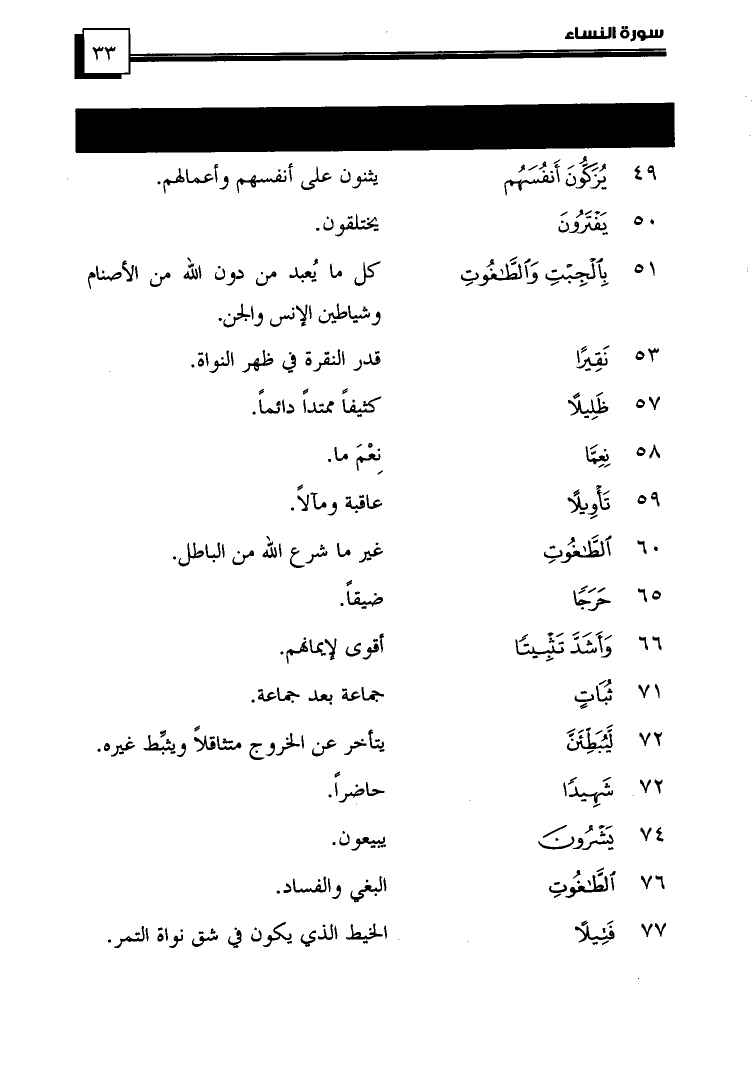 (53) ... {نَقِيرًا} ... قَدْرَ النَّقْرَةِ وَهِيَ الحُفْرَةُ فِي ظَهْرِ النَّوَاةِ.