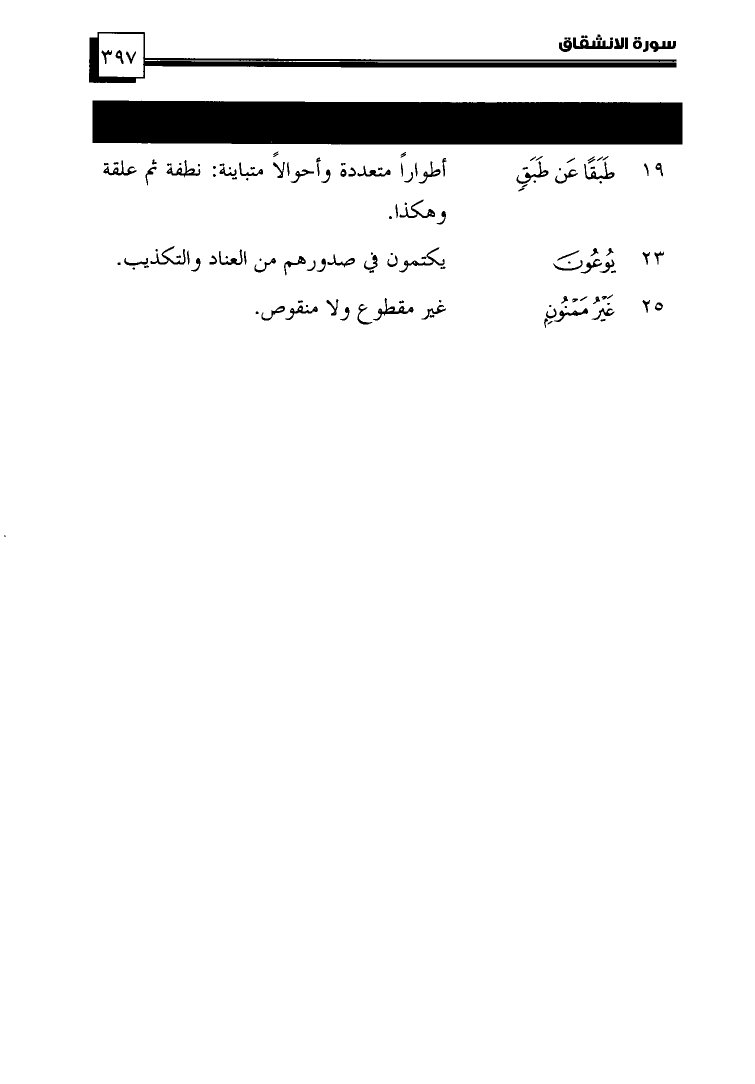 (19) ... {طَبَقًا عَن طَبَقٍ} ... أَطْوَارًا مُتَعَدِّدَةً، وَأَحْوَالًا مُتَبَايِنَةً: نُطْفَةً، ثُمَ عَلَقَةً، وَهَكَذَا.