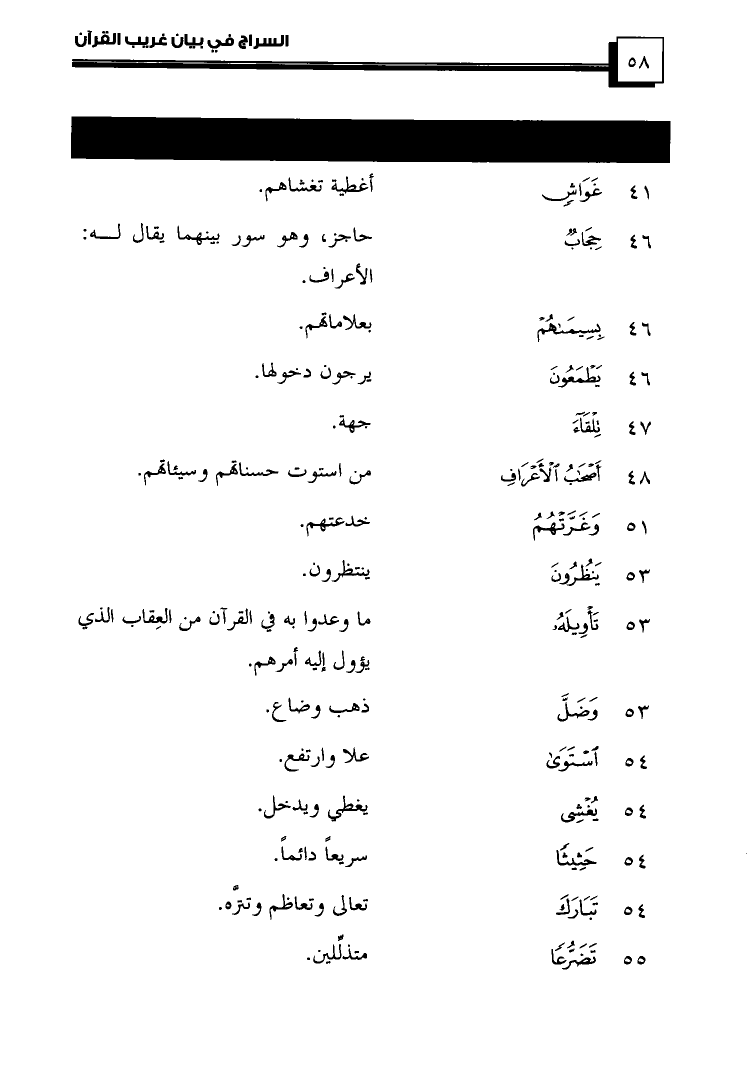 (46) ... {حِجَابٌ} ... حَاجِزٌ، وَهُوَ سُورٌ بَيْنَهُمَا، يُقَالُ لَهٌ: (الأَعْرَافُ).