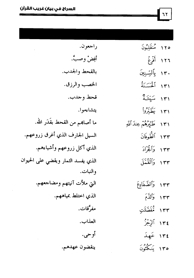 (133) ... {الطُّوفَانَ} ... السَّيْلَ الْجَارِفَ الَّذِي أَغْرَقَ زُرُوعَهُمْ.