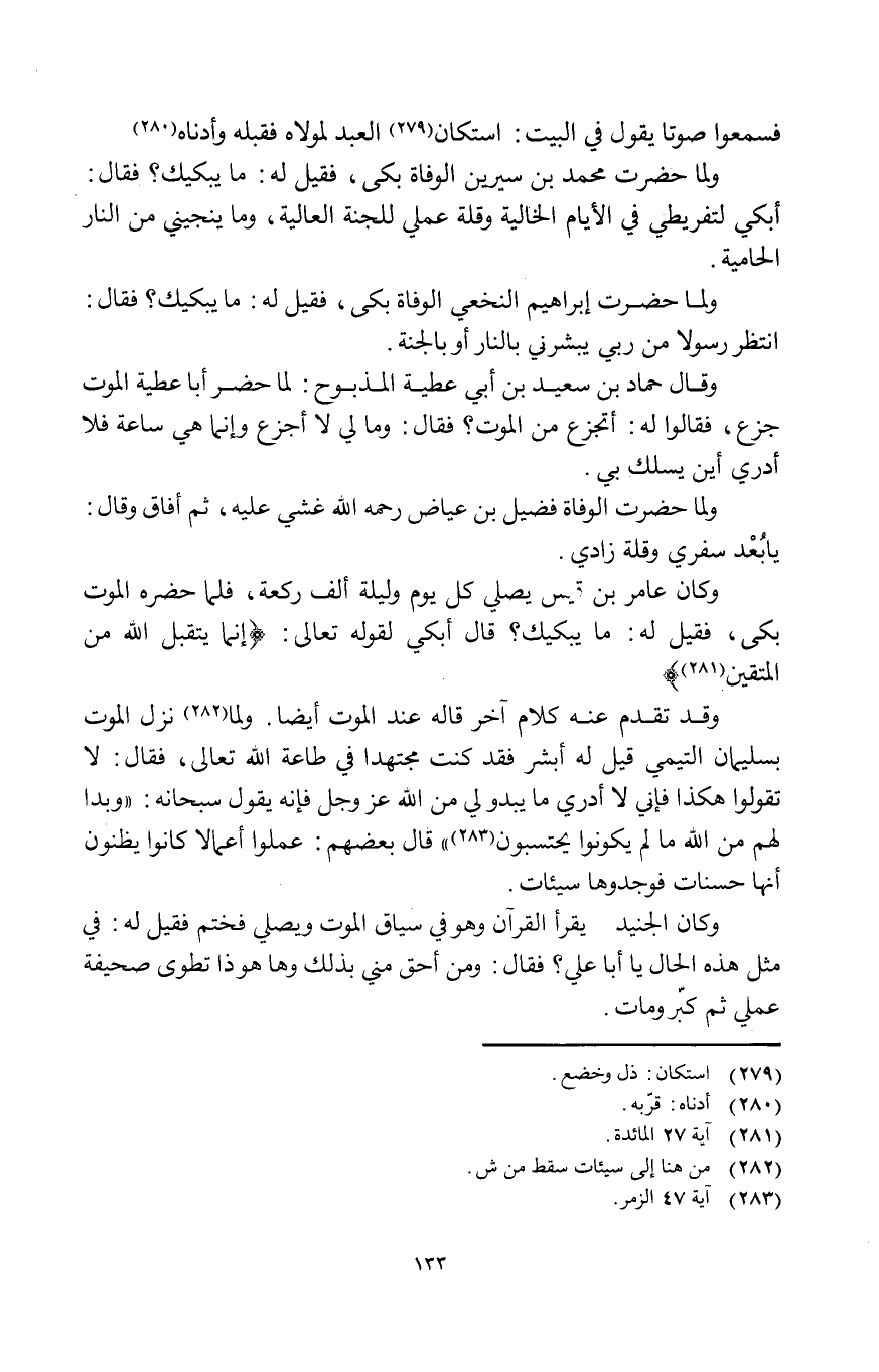 وَكَانَ الْجُنَيْد يقْرَأ القرأن وَهُوَ فِي سِيَاق الْمَوْت وَيُصلي فختم فَقيل لَهُ فِي مثل هَذِه الْحَال يَا أَبَا عَليّ فَقَالَ وَمن أَحَق مني بذلك وَهَا هُوَ ذَا تطوى صحيفَة عَمَلي ثمَّ كبر وَمَات